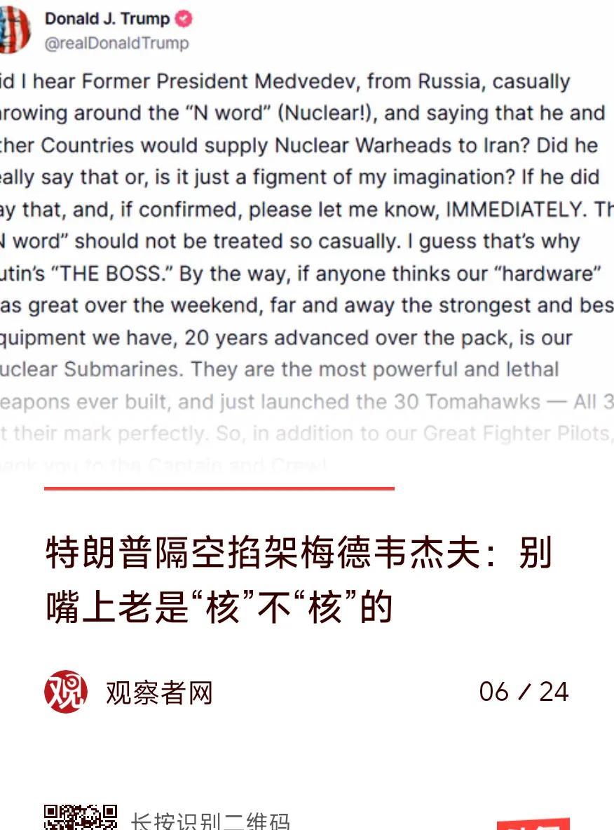 在核武器上,梅德韦杰夫“动口”,特朗普“动手”。 梅德韦杰夫经常将核威胁挂在嘴上