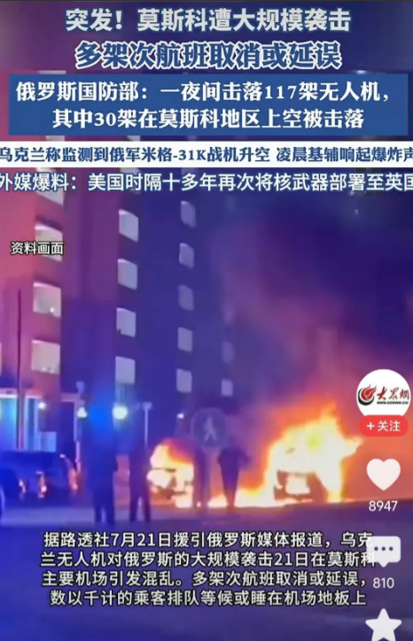 俄导弹无人机袭击乌全境,乌无人机反手袭击莫斯科!引发多处起火,各大机场关闭,不少航班取消或延误!