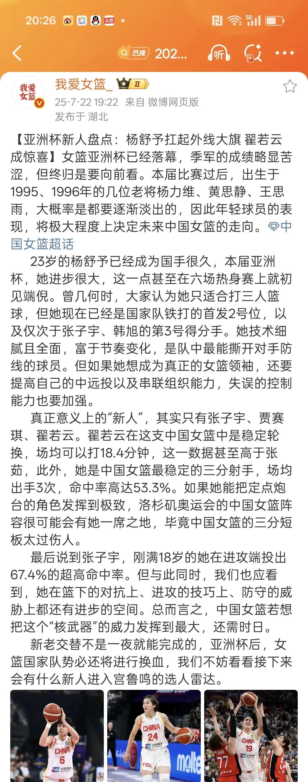 中国女篮随队记者盘点女篮亚洲杯指出,翟若云或将成中国女篮洛杉矶奥运会的惊喜! 今天,中国女篮随队记者#我爱女篮# 透露,本届亚洲杯后,中国女篮的王思雨、杨力维、黄思静等老将必将淡出下一次重大国际赛事即洛杉矶奥运会的赛场。年轻球员的表现,将极大程度决定中国女篮未来的走向。 “我爱女篮”在对本届女篮亚洲杯进行盘点中指出:翟若云在这支中国女篮中是稳定轮换,场均可以打18.4分钟,这一数据甚至高于张茹,此外,她是中国女篮最稳定的三分射手,场均出手3次,命中率高达53.3%。如果她能把定点炮台的角色发挥到极致,洛杉矶奥运会的中国女篮阵容很可能会有她一席之地,毕竟中国女篮的三分短板太过伤人。 何以如此定义翟若云呢?翟若云对阵印度尼西亚出场23分钟得12分,对阵韩国出场14分钟得3分,对阵新西兰出场23分钟得到5分,对阵日本女篮出场6分钟得到3分,对阵韩国23分钟得到3分。翟若云共出场89分,得到26分。她的所有得分几乎全部来自于外线3分,与其他锋线新人罗欣棫、贾赛琪相比较,三分命中率更高。 作为中国女篮打传统内线,也必须保证外线火力具有现代篮球的技战术,未来中国女篮必须考虑翟若云这个三分投手在球队中的技战术地位。只有这样,中国女篮的内外线威慑力才能做到均衡提升。
