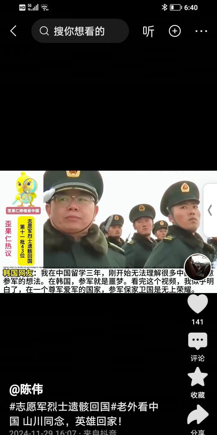 志愿军回家! 历史书太薄,装不下他们的伟大,我们随手一翻,就是他们的一生…… 历史书又太厚,我们记不住他们的名字,只知道他们叫英雄…… 虽素未谋面,但身受其恩, 怕下笔太重,惊扰了烈士的英魂,又怕下笔太轻,描绘不出他们惊天动地的往昔 铭记历史,勿忘国耻,致敬英烈 !愿用吾辈之青春捍卫盛世之中华。