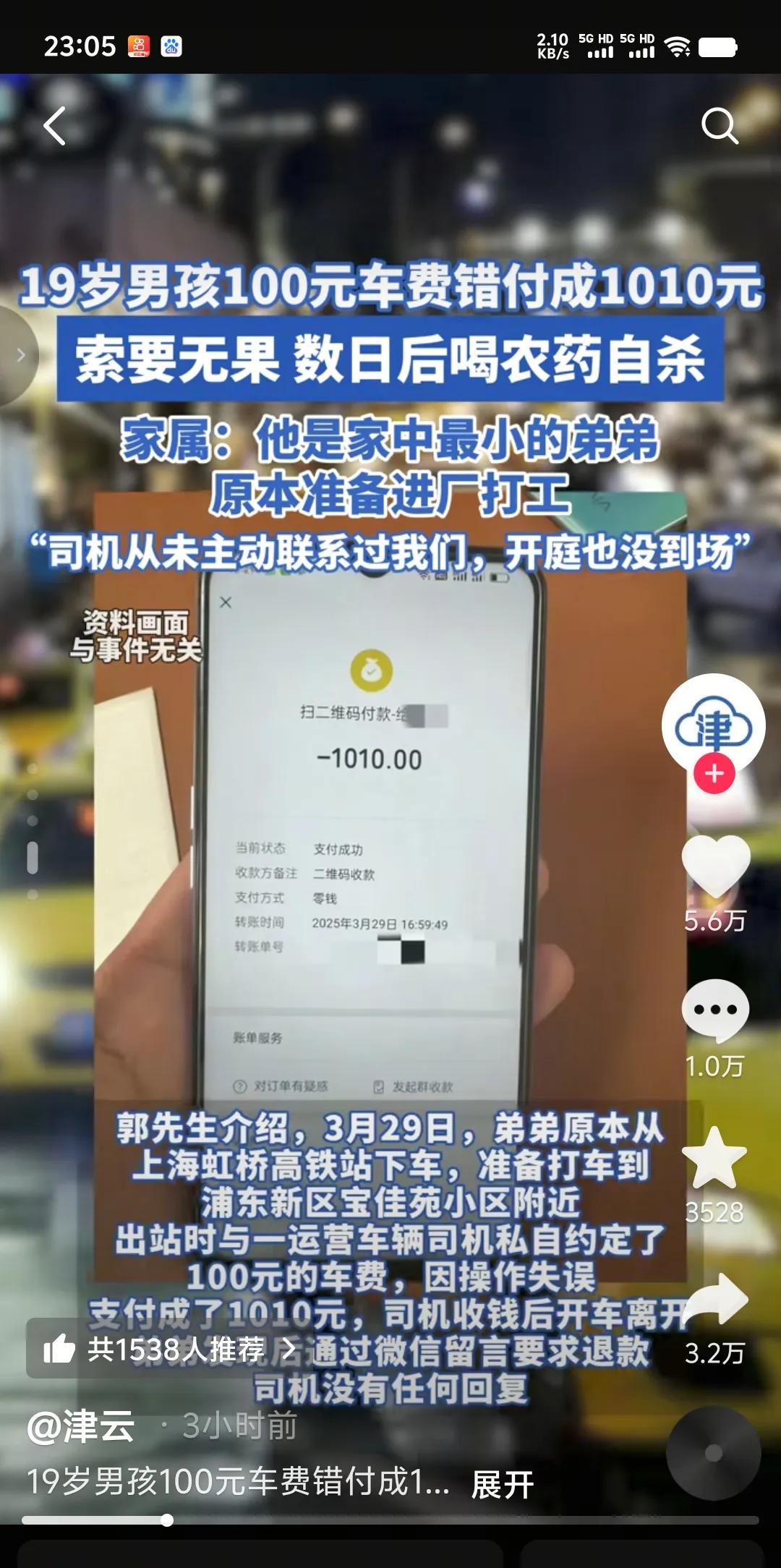 910块钱对于有些人来说或许就是一条烟钱,一顿饭钱,一双鞋钱,一次美容钱…,然而对于河南鹤壁19岁的男孩来说,那就是一条命钱。因为打车不小心付错了钱,多付了910块钱,多次索要无果,最终选择了喝农药自杀。 因为910块钱就选择了自杀,相信很多人一定会说“这也太傻了,太不把生命当回事了”。可谁又真正了解男孩的内心世界,家境贫穷,家里五口人,父亲有病丧失劳动力,主要靠母亲打零工。又是火车票又是汽车票好不容易来到上海,还没找下工作便损失了910块钱,恨自己不小心,恨司机太无情,觉得愧对家里人,再加上男孩性格内向,一时想不开,最终酿成惨剧。 100块钱误付成1010块钱,如果是多付了9100块钱呢?91000块钱呢?难道司机还是拒返吗?我们不知道整个事件最终怎么解决,但可以肯定的是男孩的死跟司机有直接的关系,司机的行为无异于强盗行为。虽然没偷没抢,但跟捡到别人东西,失主找上门来拒不归还又有什么区别呢?分明是强行霸占。