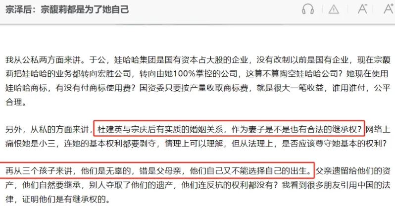 言下之意就是警告宗馥莉——杜建英毕竟是你小妈,三个弟妹也是无辜的,他们都有合法继承权,你不能剥夺他们的基本权利!