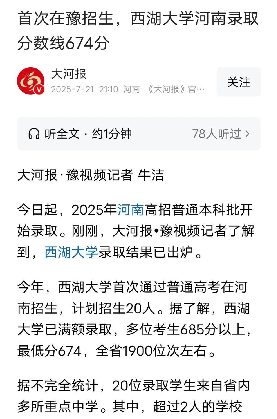 西湖大学录取分真高。 河南最低分674分,全省1900名。 重庆最低669分,全
