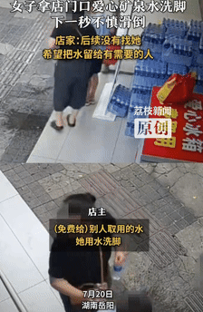 湖南岳阳,一位热心店主在店前摆了爱心冰箱,里面塞满矿泉水,还贴上“免费取水”的牌子,想给户外工作者解渴。当天,一穿着拖鞋的女子脚黏不舒服,看到爱心冰箱里的水,拿了两瓶站在滑溜溜台阶上洗脚。刚洗完转身就摔了个大跟头,疼得直咧嘴。旁边俩孩子虽觉得她行为不妥,仍想伸手扶。店主后来发现门口水痕,调监控看到这一幕气坏了,他本意是让大家合理取水解渴,女子却拿水洗脚糟蹋爱心。不过店主没找女子麻烦,而是发视频提醒大家别学她。
