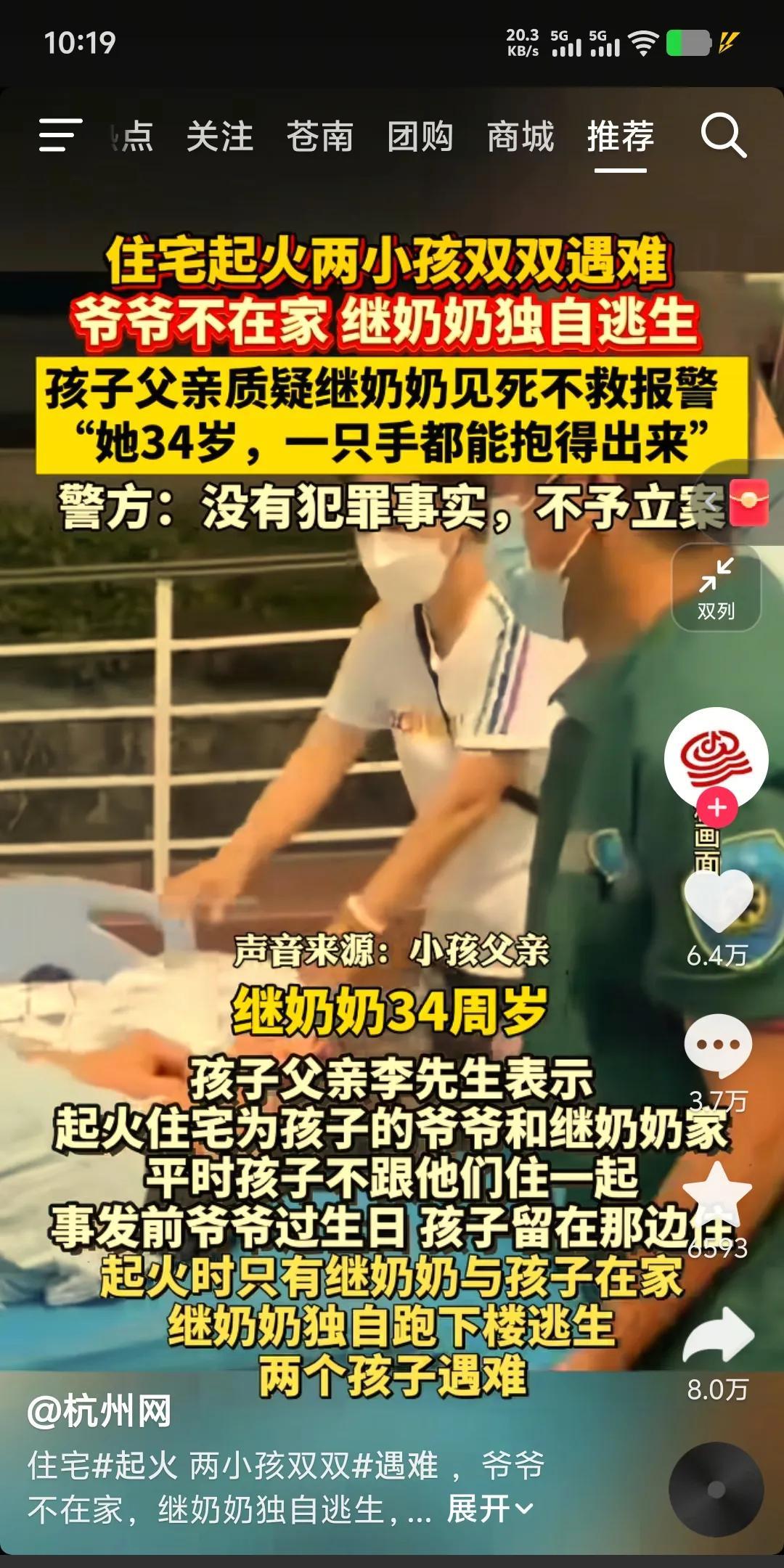 住宅起火两小孩双双遇难 爷爷不在家,继奶奶独自逃生 孩子父亲崩溃报警,质疑她见死不救 。 爸爸说“她34岁,孩子一只手能抱起来”,可继奶奶逃生时没带孩子, 自己一根头发都没烧到。 警方调查后,因没有犯罪事实不予立案 。 火灾起因是锂电池着火,悲剧已经发生,可关于“能不能救、有没有能力救”的争议一直在发酵。大家觉得在那种紧急情况下,继奶奶该怎么做?这事到底该咋看?