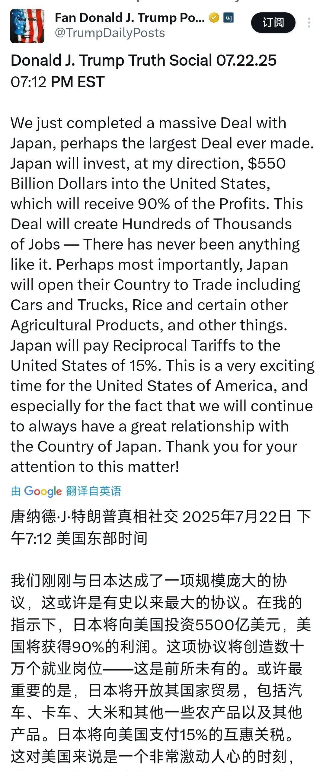 特朗普声称与日本达成贸易协议:关税15%+5500亿美元对美投资。 特朗普今天(北京时间7月23日)写道:“我们刚刚与日本达成了一项规模庞大的协议,这或许是有史以来最大的协议。在我的指示下,日本将向美国投资5500亿美元,美国将获得90%的利润。这项协议将创造数十万个就业岗位——这是前所未有的。或许最重要的是,日本将开放其国家贸易,包括汽车、卡车、大米和其他一些农产品以及其他产品。日本将向美国支付15%的互惠关税。这对美国来说是一个非常激动人心的时刻,尤其是因为我们将继续与日本保持良好的关系。感谢您对此事的关注!”