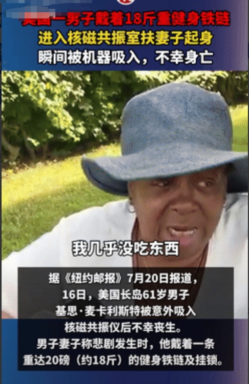 “没文化真可怕!”美国一大叔去陪妻子做核磁共振检查,等结束后就进去帮忙,不料他身上有一条18斤的健身链忘记摘了,机器瞬间转过方向将他吸了进去,周围人赶紧去帮忙,岂料为时已晚,网友:智商不在线,后果很严重! 2025年7月16日,美国纽约州一家核磁共振中心发生了一起令人痛心的安全事故。 一名陪同妻子做检查的男子,在妻子完成检查后进入扫描室帮忙,却因脖子上戴着一条9公斤重的金属负重项链,被仪器产生的强磁场瞬间吸附,最终经抢救无效于次日离世。 这场悲剧不仅夺走了一条生命,更将核磁共振检查的安全隐患再次推到公众面前。 要理解这起事故的根源,需要了解核磁共振检查的基本原理。 核磁共振成像(MRI)是通过人体氢原子在强磁场中发生共振来生成影像的技术,它能清晰呈现全身各部位的结构,且没有电离辐射,因此在临床上应用广泛。 但很多人不知道的是,核磁共振仪器运行时会产生极强的静磁场,其强度是地球磁场的几万倍,即使检查暂停,磁场也不会立刻消失,就像一个巨大的“隐形吸铁石”持续存在于检查室中。 这也是为什么进入检查室前,医护人员总会反复询问是否携带金属物品,因为强磁场对金属的吸附力足以对人体造成严重伤害。 不仅如此,强磁场还可能导致金属物品乱飞,对价值上百万、上千万的核磁共振仪器造成伤害。 此前有医学生调侃,如果遇见医闹,医学生可以往影像检查室内跑,因为里面随随便便一个仪器就能立刻导致医院极大的重视,从而以最快的速度制止医闹。 言归正传,强磁场对金属物品的影响主要体现在三个方面,最直接的是物理吸附,任何铁磁性金属都会被快速拉向仪器,速度和力量超乎想象。 像手机、钥匙甚至氧气罐等物品都可能被磁场吸附,一旦砸向人体,后果不堪设想。 2001年纽约就发生过类似悲剧,一名6岁儿童接受检查时,一个氧气罐被吸入扫描室,最终导致孩子死亡。 除了物理撞击,金属物品在磁场中还可能引发灼伤。 磁场产生的热量会通过金属传导到皮肤,时间久了可能造成红肿、起水泡甚至溃烂。 这一点在衣物上体现得尤为明显,现在很多运动服装为了达到抗菌、除臭效果,会在面料中加入银、铜等微金属纤维,比如一些瑜伽裤、训练短袖就采用这种设计。 浙江一位女士做核磁共振时,就因穿着含金属纤维的瑜伽裤被医生要求更换,有记者穿着这类裤子体验时,短短几分钟就感到腿部明显发热,虽然检查后没有异样,但长期接触的风险不容忽视。 此外,金属还会干扰磁场均匀性,在影像中形成“伪影”,就像有人因衣服上的小刺绣被误判为肺部结节一样,影响医生的准确诊断。 对于体内有植入物的人来说,核磁共振检查的风险更需要谨慎评估。 并非所有植入物都不能接触磁场,医学上通常将其分为三类:安全类、特定条件安全类和不安全类。像冠脉支架、人工心脏瓣膜等大多属于安全类,在3.0T以下磁场中检查没问题。 而颅内动脉瘤夹这类则需要满足术后时间和磁场强度条件,而胰岛素泵、磁性义眼等属于绝对禁忌,严禁进入检查室。 回顾这起纽约事故,其实存在多个本可避免的环节。 医院通常会在检查室门口设置醒目的警示标识,提醒禁止携带金属物品进入,医护人员也会在检查前对陪同人员进行安全告知。 但这位男子不仅佩戴了远超日常的重型金属项链,还在未得到许可的情况下进入危险区域,最终酿成悲剧。 类似的疏忽在过去并不少见,2023年加州一名护士靠近仪器时,一张病床被磁场吸附,她被夹在仪器和病床之间造成压伤,不得不接受手术治疗。 要避免核磁共振检查中的安全风险,关键在于做好三方面准备。 衣物选择方面,尽量穿棉质、宽松、没有金属装饰的衣服,女性可以提前穿无钢圈内衣,检查当天不化妆,因为有些化妆品也含细金属颗粒。 其次是物品清理,进入检查室前务必取下所有金属物品,包括项链、耳环、钥匙、手机等,交由家属保管或存放在储物柜中。 如果贴了膏药、暖宝宝,也要提前撕下。 最重要的是主动沟通,体内有植入物或做过手术的人,一定要提前告知医护人员,说明植入物的类型和手术时间。 如果不确定植入物材质,可联系主治医生或查询既往病历,切勿抱有侥幸心理。 检查过程中如果感到不适,要立刻通过呼叫装置告知工作人员,对于病情较重需要陪同的患者,医院通常会提供无磁性的轮椅和推床,避免使用个人携带的金属器械。 这场发生在美国的核磁共振事故,本质上是对医疗安全规则的忽视。 核磁共振技术为疾病诊断带来了便利,但它的潜在风险需要每个人警惕。 无论是患者还是陪同人员,都应正视医护人员的安全提醒,遵守检查流程,才能让先进的医疗技术真正服务于健康,而非酿成悲剧。 对此,你有什么看法?