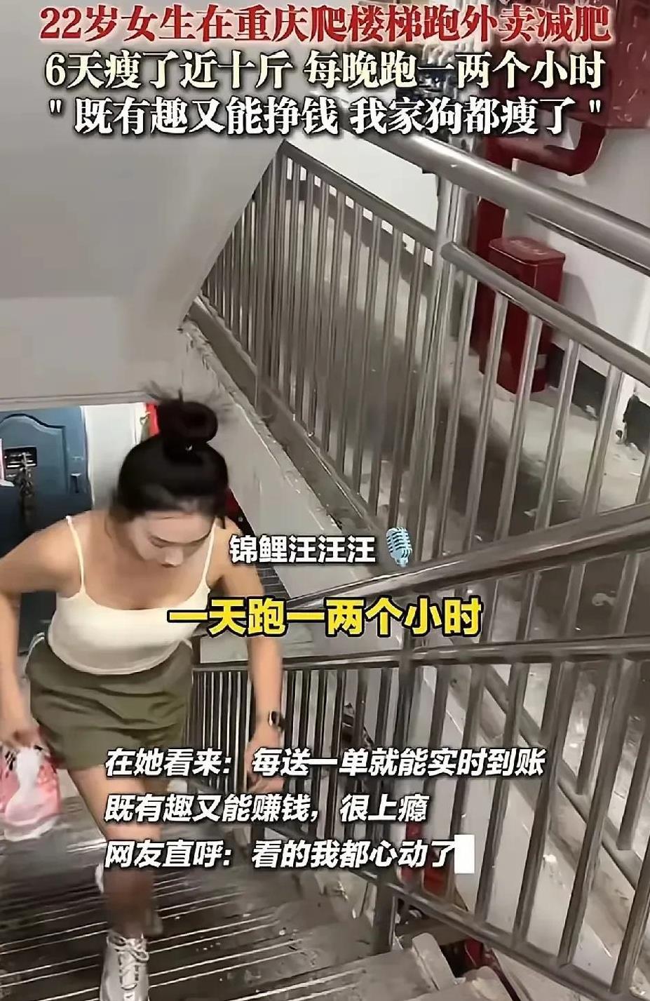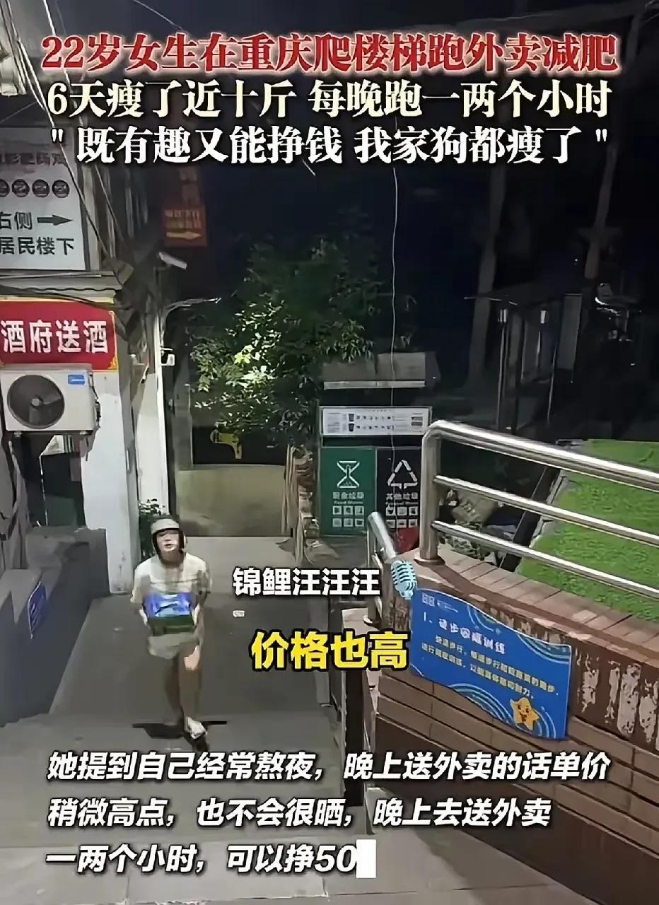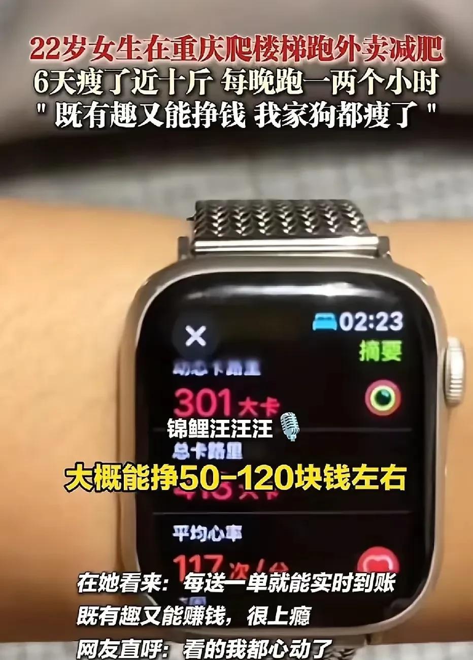 这年轻人可真是个明白人啊,不但减肥成功了,还挣到了钱,最关键的是非常享受这种体验,人生之乐也不过如此了!弄得我都想去送外卖了,既能锻炼身体又能减肥。新的途径已经给姐妹们开辟好了,就看姐妹们能不能把握住了。先别说一两个小时能挣50 - 100元,夏天晚上骑电车可凉快了,主要是爬楼既能减肥还有收益呢。