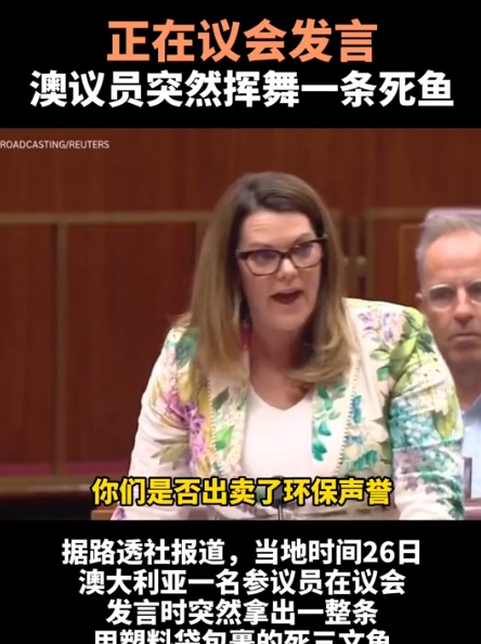 这不是你点错了外卖,而是绿党参议员莎拉·汉森-杨现场“表演”的:她在质询时,把这条裹着塑料袋的死鱼拿出来,一边晃着一边质问政府:“你们是不是为了这条又臭又烂的三文鱼,把环保标准都抛到脑后了?”