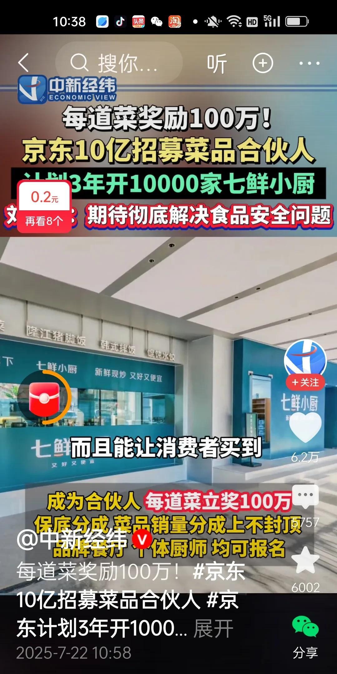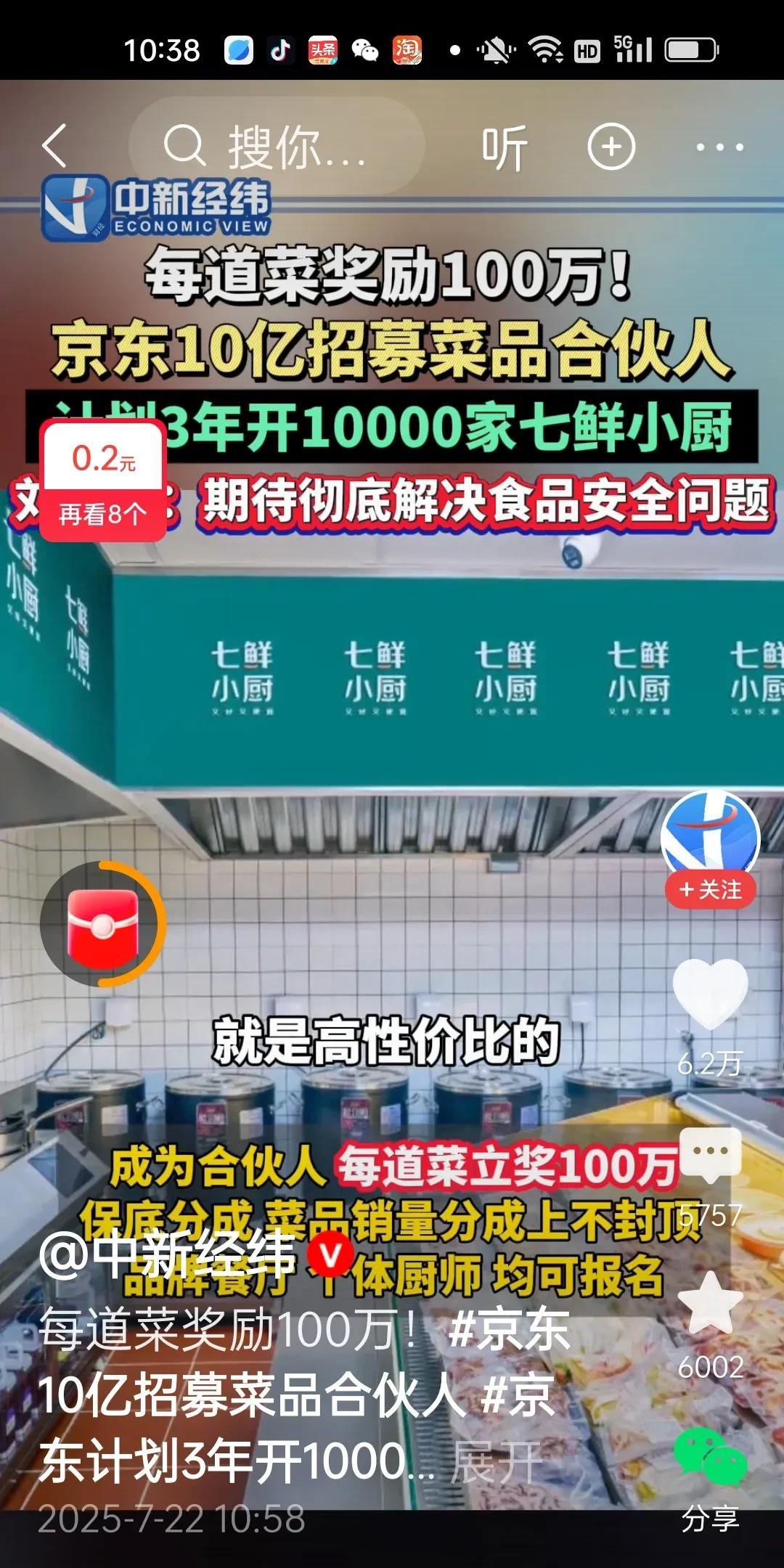 市场规范,食品安全真要靠他们? 京东要投资10亿,3年内招募1万家加盟商,加盟七鲜小厨。 成为京东合伙人后,每道菜奖励100万,保底分成,菜品销量分成,餐厅,个体厨师都可报名。 刘强东说,要能够真正解决食品安全问题。 成为胖东来零售业市场典范。 京东又来解决食品安全问题。 市场规范,社会进步,真的要依靠这些商人?