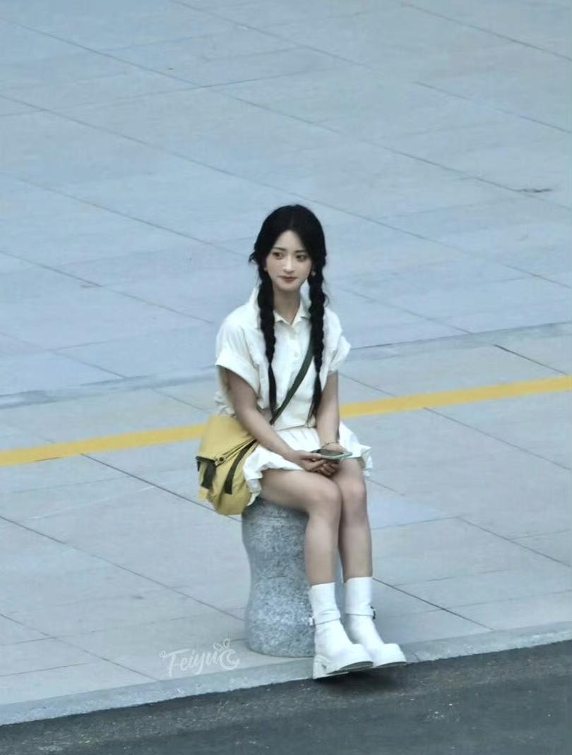沈月这样乖乖的坐在石墩上,好可爱!沈月长得是真的好看,这么老远都第一时间被她的颜值吸引,除了身高之外,沈月真的无敌,很适合吃娱乐圈这碗饭!