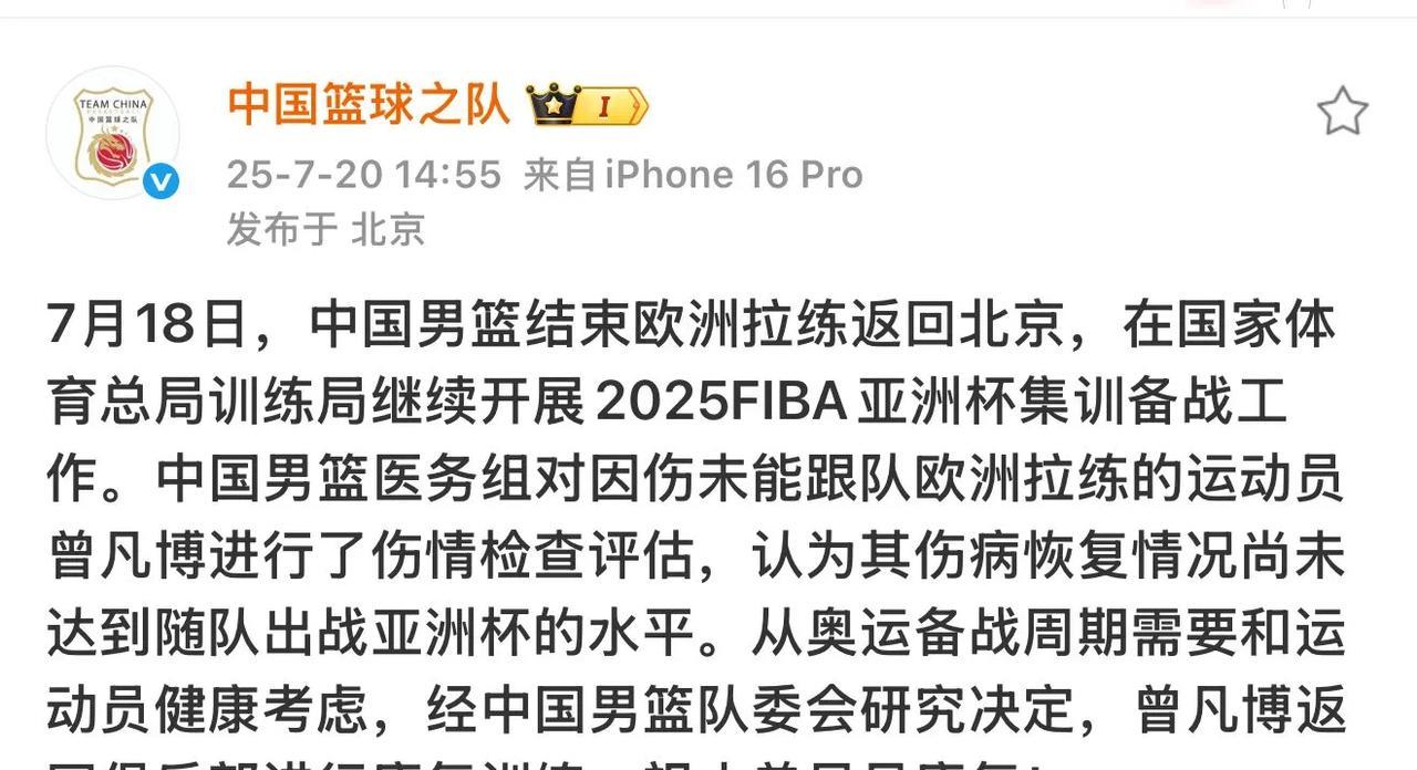 小曾恢复不乐观,暂离国家队,基本无缘亚洲杯 早几天才看到曾凡博回到国家队,前天国家队又发出了公告,国家队医务组对小曾的伤病进行了评测,认为其伤病未达到出战亚洲杯的水平,研究决定,小曾返回俱乐部训练康复。 小曾这次伤病真的来的太突然了,对于小曾来说真的损失很大,首先不受伤北京队有可能夺冠,小曾携夺冠功臣之威进军NBA夏季联赛,据悉好几支NBA球队愿意给他一份短合同打夏季联赛,然后再回国参加亚洲杯,国家队地位也能够得到提升,届时也有希望在国家队大放异彩。 中国球员身体还是太脆了,看看姚明、易建联、周琦哪个不是毁于伤病,包括华人球员林书豪也是,表现最好的时候受伤了,小曾这次大伤真的太可惜了,希望好好康复吧,打好下赛季,明年休赛季还有机会,加油!
