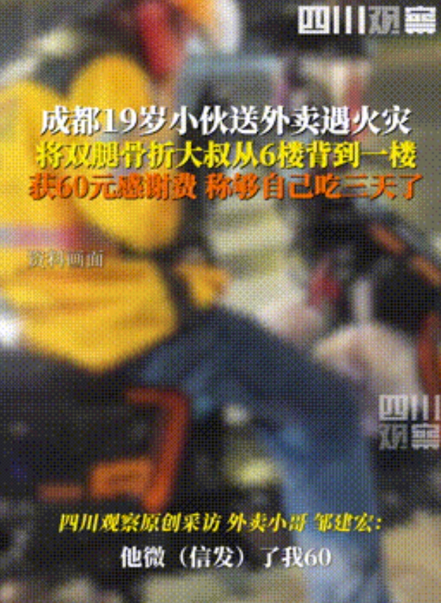 “他给我60,够我吃3天了!”四川,19岁小伙送外卖时遇火灾,为了救人,把双腿骨折的大叔从6楼,咬牙背到了1楼,事后大叔转给小伙60元感谢,而小伙却觉得很惊喜,只因这钱够他3天伙食费了!网友:知足最难得![太阳]