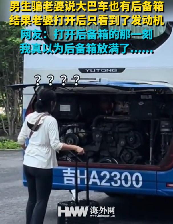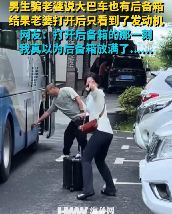 笑不活了!山东,夫妻俩跟着旅行团去游玩,可准备坐大巴装行李时,丈夫却骗妻子说大巴车也有后备箱,没想到,妻子信以为真,真的把大巴车的后盖打开了,可看到里面满满的发动机,却直接愣在了原地,说好的后备箱哪去了? 两人刚到大巴车旁,丈夫眼珠一转,看着媳妇一脸认真地推着大行李箱,就随口来了一句:“你去后备箱放吧,空间大。” 结果媳妇还真没多想,行李箱拉到大巴车尾巴,直接把后车盖一掀开,还没等她高高兴兴地塞进去,就被眼前一幕给愣住了,哪里是后备箱,满满当当的都是发动机和各种线路。媳妇一下子站那儿,彻底懵了神 丈夫在一旁忍不住乐出声,视频都录上了,全程毫不掩饰地偷着乐。这时候司机师傅也过来了,见状赶紧解释,大巴车行李舱其实是在车身两侧底部,并不在尾部,发动机后置的大巴压根没有“轿车后备箱”这一说法 有网友表示:要是我我也会被骗,打开后备箱的那一刻,我以为后备箱是放满了 其实这还真不能怪妻子不懂,现在确实很多人对公共交通设施确实不太了解。特别是随着私家车普及,不少人出门都自己开车,对大巴、公交这些公共交通工具的结构反而不熟悉了 就像这位妻子,可能平时都是开自家小轿车,突然坐大巴,就被丈夫钻了空子 说起来,大巴车的后置发动机,很多人平时真不了解,还以为和自家小轿车没啥区别。生活里有时候就需要这种被“打破认知”的瞬间,给单调的行程添点彩 #男生骗老婆说大巴车也有后备箱#