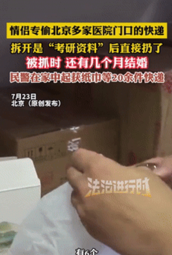 偷上瘾了?北京,一情侣专偷医院门口的快递,吃的喝的全都不放过,当警察找上门时,竟发现其家中还有专门摆快递的货架,被抓时,他们还有几个月就要结婚了! 据法治进行时7月23日的报道,事情要从六月中旬说起,有医生打电话报警,表示自己的快递被人给偷走了。 了解到情况后,民警就去查看监控,发现偷东西的是一对男女,骑着白色电动车,手法很老练,拿了快递就走,整个过程不到一分钟。 并且他们很会躲摄像头,每次走的路线也都不一样,直到几天后,同样的事情又发生了两次。 经过仔细比对后,发现偷东西的还是那对男女,他们像是摸清了医院的规律,专挑快递多的时候下手,被盗的东西五花八门,吃喝用度都有。 不过,好在民警最终还是发现了关键线索,那就是俩人最后消失的地方,都在某个小区的附近。 于是民警开始对那个小区进行排查。功夫不负有心人,在某栋居民楼的监控里,发现了重要线索。 只见那对男女,每天都要倒好多次垃圾,且外形和偷东西那俩人很像,在确定好楼层后,民警就找了过去。 而结果就是在某户人家的外面,看到了许多的快递包装,其中有个箱子里,还放有关于考试的资料。 当看到包裹上显示的收货地址,是医院的快递柜,就更加确定对方的身份,于是就立刻采取了行动。 当场就在其家里面,发现有很多偷来的快递,在证据摆在眼前时,那对男女也承认了所作所为, 可能让他俩都没想到的是,正是那份被被丢弃的资料,才让他们露了馅,现在两人因为涉嫌盗窃,已经被当地刑事拘留。 医院是救死扶伤的地方,本来医生他们就很辛苦,还要为这种事操心,那些被偷的资料,说不定关系着医生的职业发展。 可这对情侣为了一点小便宜,不仅害了自己,也给别人添了不少麻烦。 信息来源:法治进行时 《情侣专偷北京多家医院门口的快递,拆开是“考研资料”后直接扔了,被抓时 还有几个月结婚,民警在家中起获纸巾等20余件快递》2025-7-23