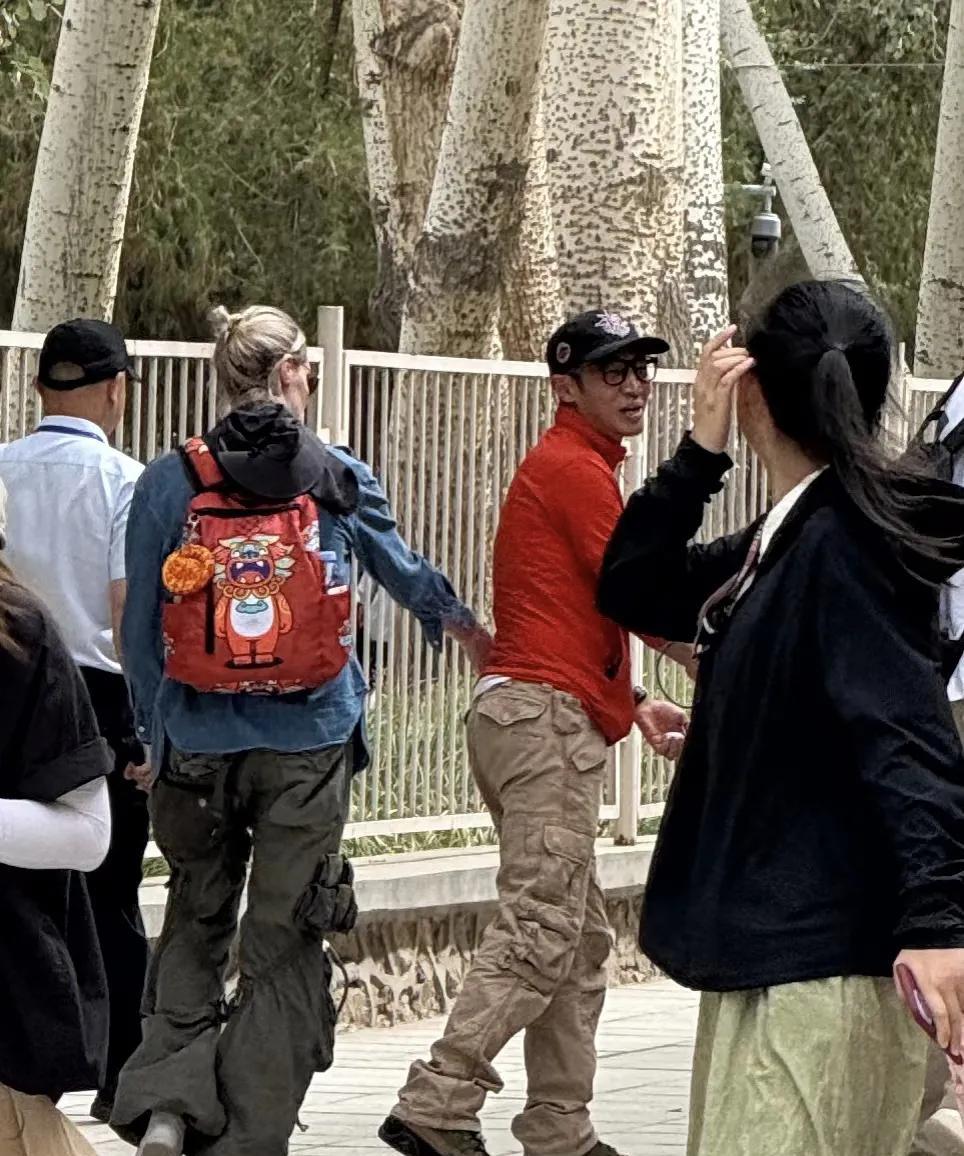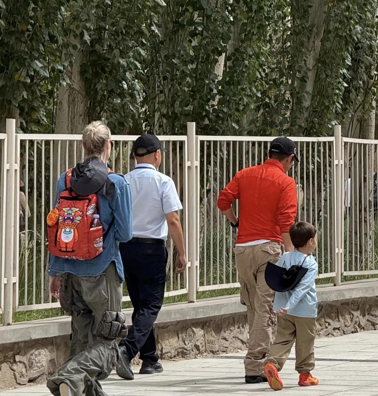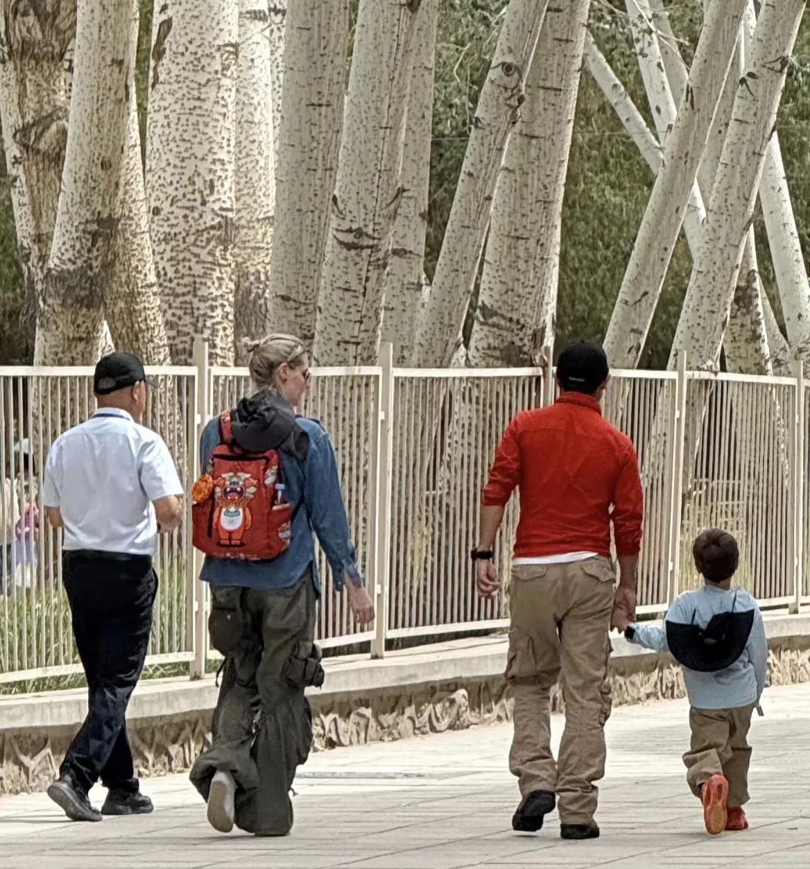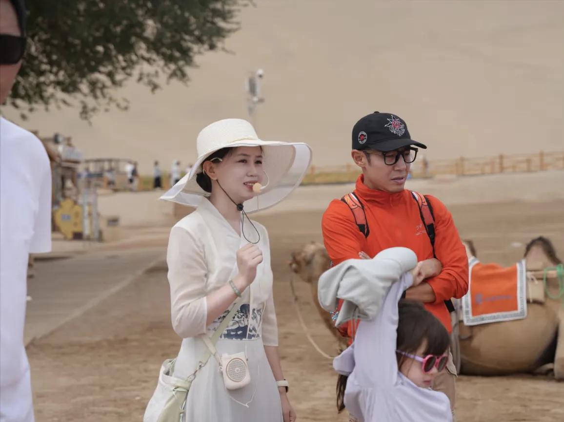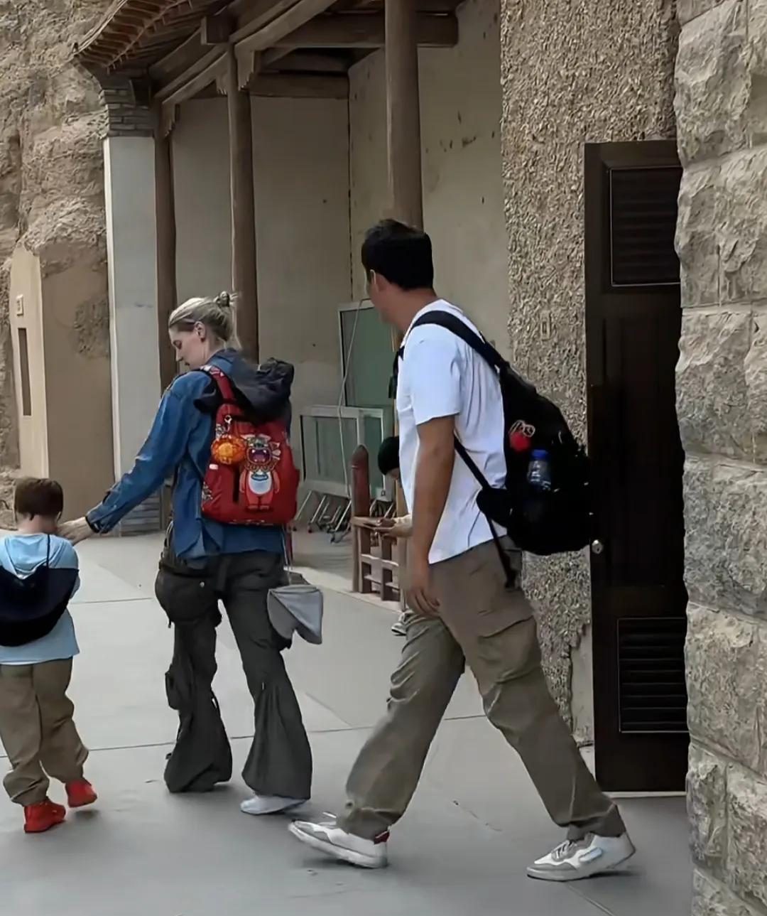 撒贝宁和家人到甘肃敦煌旅游,加拿大籍妻子李白的身材好高挑,夫妻俩一人牵着一个孩子
