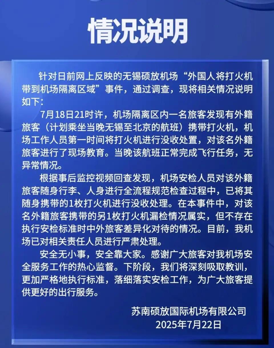 “外国女游客为何可以携带打火机进机场?”江苏无锡,一男子猛然发现邻座的外国女游客