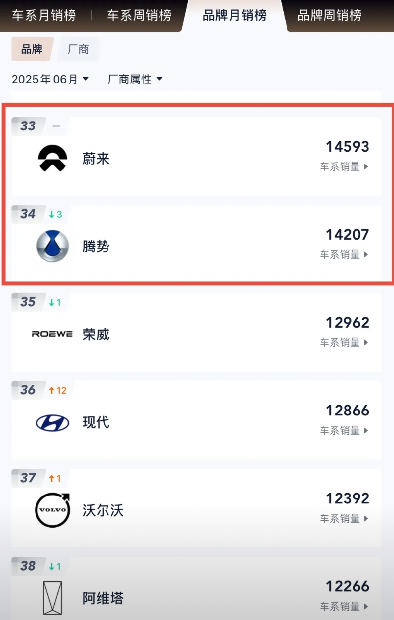 看看蔚来汽车6月份的销量才14593台,跟比亚迪的“小号”腾势销量几乎一样,你蔚来是“大号”人家只是“小号”啊,销量排名排在33位!