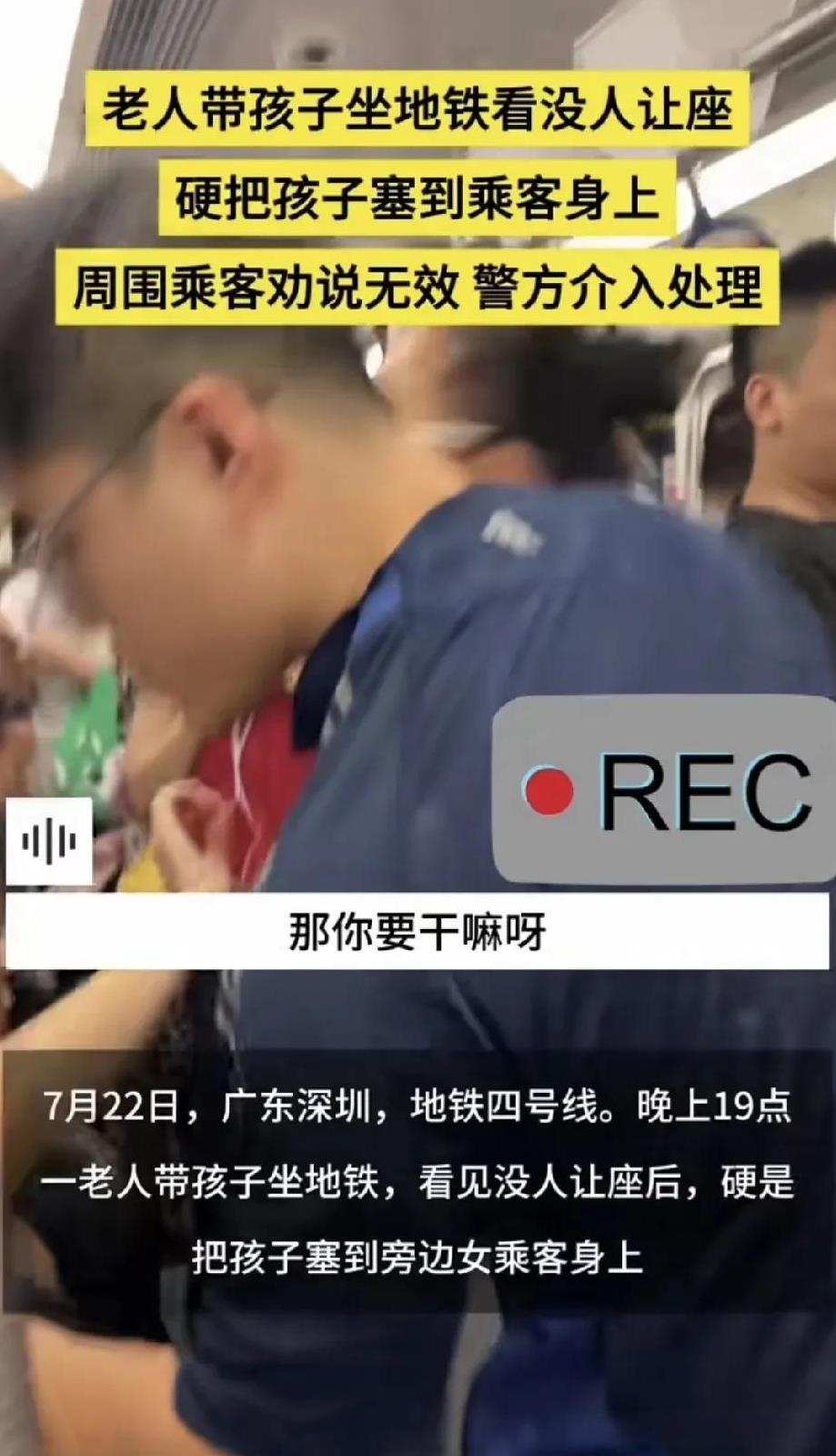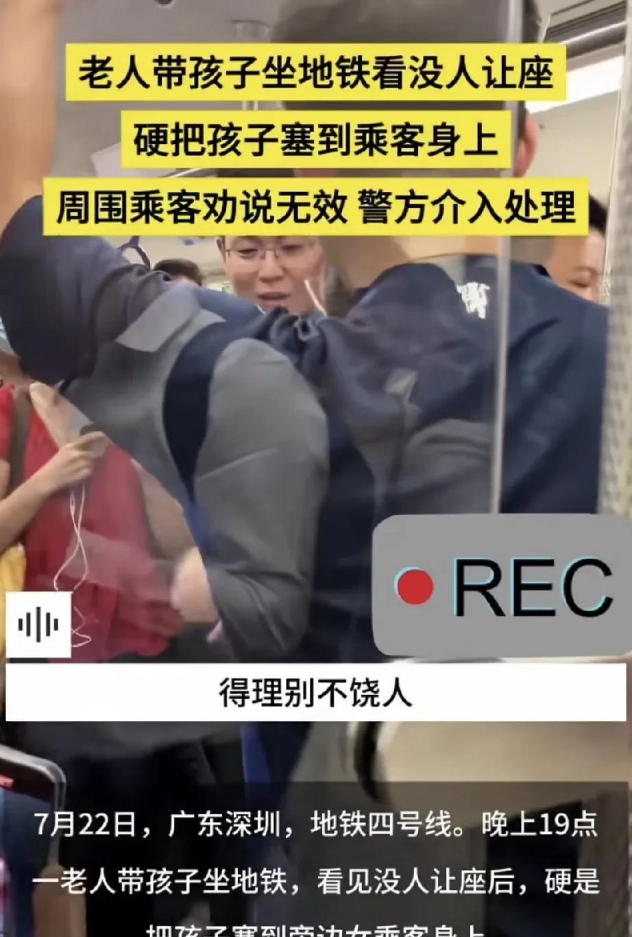 广东深圳有位老人带着孩子乘坐地铁,见没人让座,就直接把孩子塞到女乘客身上。同一车