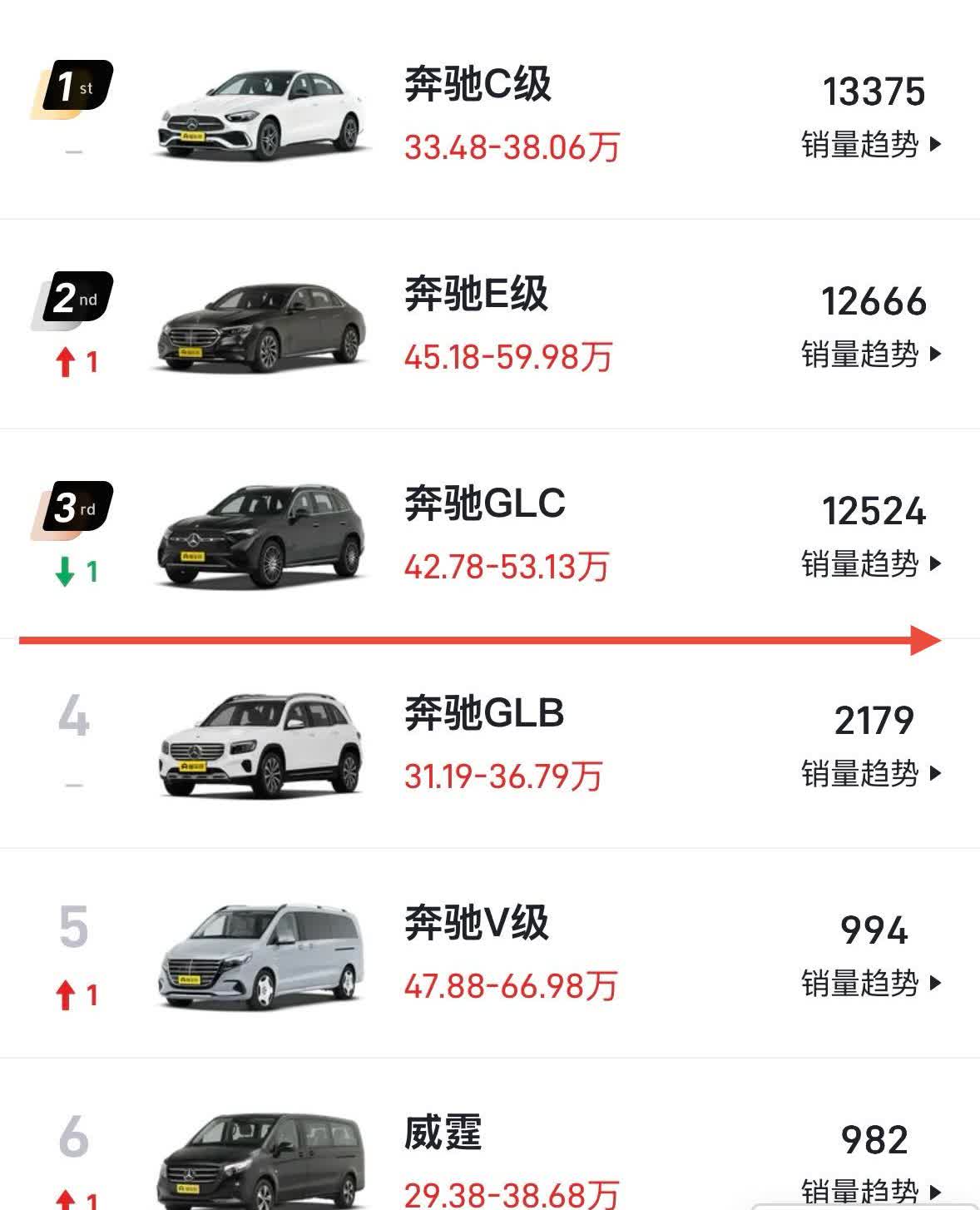 冰火两重天 用来形容奔驰再合适不过了 奔驰C级、E级、GLC三款是绝对销量主力 月销量均在万辆以上 但自此之下 其他车型的销量可以说是断崖式下跌【来自懂车帝车友圈】