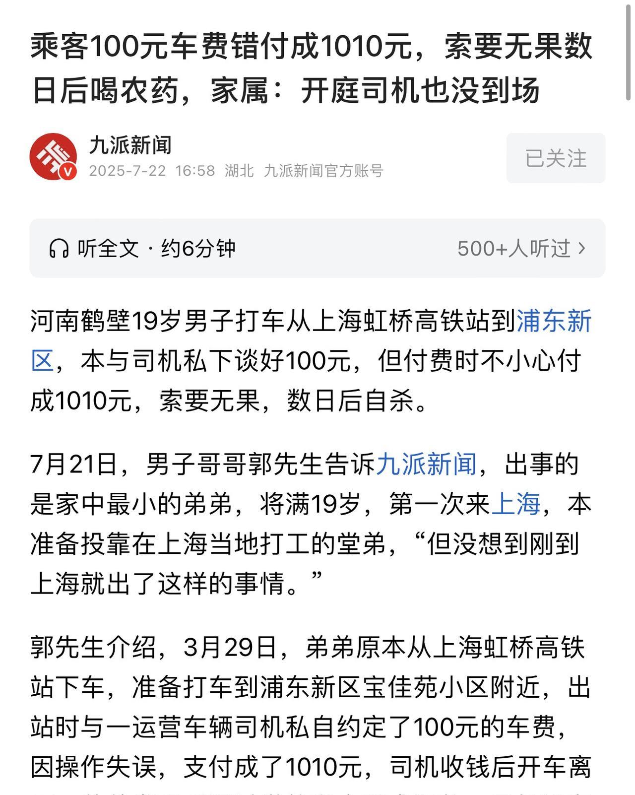 上海,一19岁小伙来当地打工,结果下了飞机后,与司机谈好了100元的车费,却误付成了1010元,下车后小伙发现竟然多付了,于是便联系司机讨要,可是司机根本不搭理小伙,谁知几天后,小伙竟然服毒自尽。 据悉,小伙小郭今年19岁,打算到上海来投奔堂弟,结果刚下了飞机,与一运营司机谈好了100元的车费,结果下车时却失误支付成了1010元,小郭发现后,试图联系司机希望对方返还,结果对方根本不予理会。 无奈,第二天小郭就报了警,民警帮着小郭提供了对方车牌等信息,但是更多的信息没办法提供,为了这件事情,小郭就一直没去找工作。 然而,几天后,家人发现小郭联系不上了,于是赶紧来了上海,最后,在警方的帮助下,最终在苏州的一山上发现了小郭的遗体。 事发后,小郭家人将涉事司机告上了法院,要求司机返还多收取的费用,目前案件已经开过庭,正等待法院的下一步安排。 有人说,这种人不适合做自己,多付了就退费给人家,怎么一句话也不说? 还有人说,我也是司机,这种事情遇到多了就麻木了,之前在车上捡到一部手机,免费跑了10公里给人家送了回去,结果一句感谢都没有。 也有人说,男的承受力太差了,这只能是一个诱因,根本不是导致小伙自杀的关键因素,肯定是一直没找到工作,加上钱也没要回来,就想不开了。 其实,从法律层面分析,小郭与司机之间存在口头约定的出租汽车运输合同关系,双方约定车费为100元,而小郭误付1010元。 根据《民法典》第九百八十五条规定:“得利人没有法律根据取得不当利益的,受损失的人可以请求得利人返还取得的利益 。” 在这个事件中,司机多收的910元没有合法依据,构成不当得利,理应返还给小郭。即便小郭不幸离世,其家属作为合法继承人,有权继承这笔债权,通过法律途径追讨。 但是,如果为了910元去起诉,这其实又需要额外的时间以及精力成本,甚至还要额外的金钱成本,比如请律师等等,所以,通过起诉要这笔钱,实际上并不合算。 而关于司机是否应对小郭的自杀承担刑事责任。依据刑法理论,构成犯罪需满足主观上有故意或过失。在本案中,司机拒绝退款的行为,从常理推断,他无法预见小郭会因910元纠纷而自杀,不存在疏忽大意或过于自信的过失,其不退款行为与小郭自杀之间也不存在刑法上直接、必然的因果关系,所以司机不构成过失致人死亡罪。 但在民事责任方面,虽然司机无需对小郭自杀承担主要责任,但如果小郭家属主张精神损害赔偿,法院会综合考量司机的行为。若司机拒不退款的行为被认定加剧了小郭的心理压力,违反公序良俗,法院或许会酌情支持部分赔偿请求。 最后,这个司机的做法确实值得谴责,明明多收了钱,还给人家就是了,如果遇到这种情况,建议直接找平台或者是出租车公司解决。 对此,你对本案有什么看法? —————————— 关注我,带你评析法律热点,关注冷暖人生。 文章原创,抄袭必究