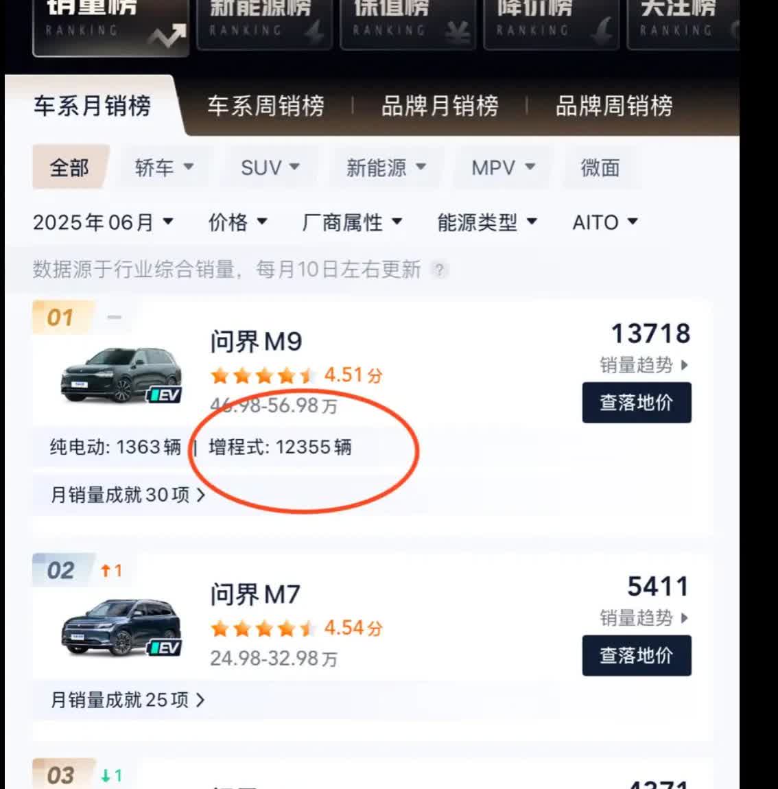 M9有增程有纯电,看下有钱人的选择。纯电m9只占了m9的十分之一。纯电只有唯一的补能方式,m9的销量差已经讲明白了一切