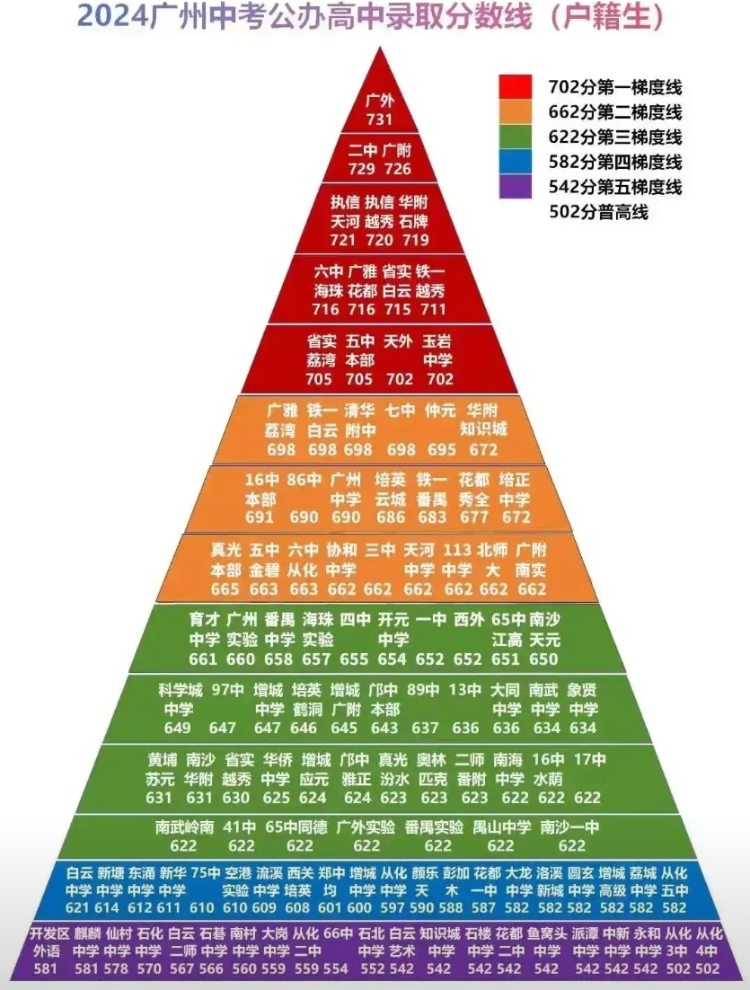 2025年与2024年广州中考录取分数线,最大的改变是,广州外国语中学跌落神坛了,说明政策是可以把一个学校抬得很高很高,以往仅在提前批录取的广外,几年都是广州第一高分,现在放在第三批,第一梯队都上不了,唉!