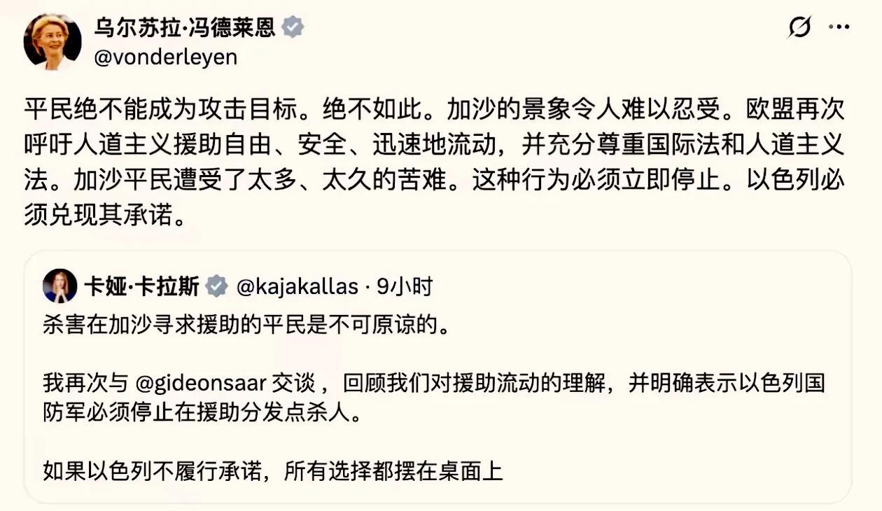 硬刚?欧盟刚喊话内塔尼亚胡:必须停止射杀平民,以高官就回怼:加沙将成以色列不可分割的一部分 7月22日,欧盟对以色列的态度发生180度大转弯,冯德莱恩喊话内塔尼亚胡必须停止射杀巴勒斯坦平民,并威胁,如果不能兑现承诺,所有选择都将被放在桌面上。 然而,就在外界纷纷猜测,是什么导致了欧盟突然转向时。 同一天,以色列财长斯莫特里奇表示,以军将对加沙“安全吞并”,加沙将成为以色列领土不可分割的一部分。 想想也是,美国都不好使,欧盟在以色列看来更什么也不是…… 不知道一向豪横,连中方都屡屡威胁的欧盟当家人,面对以色列的硬刚何去何从呢? #晒图笔记大赛# #国际#