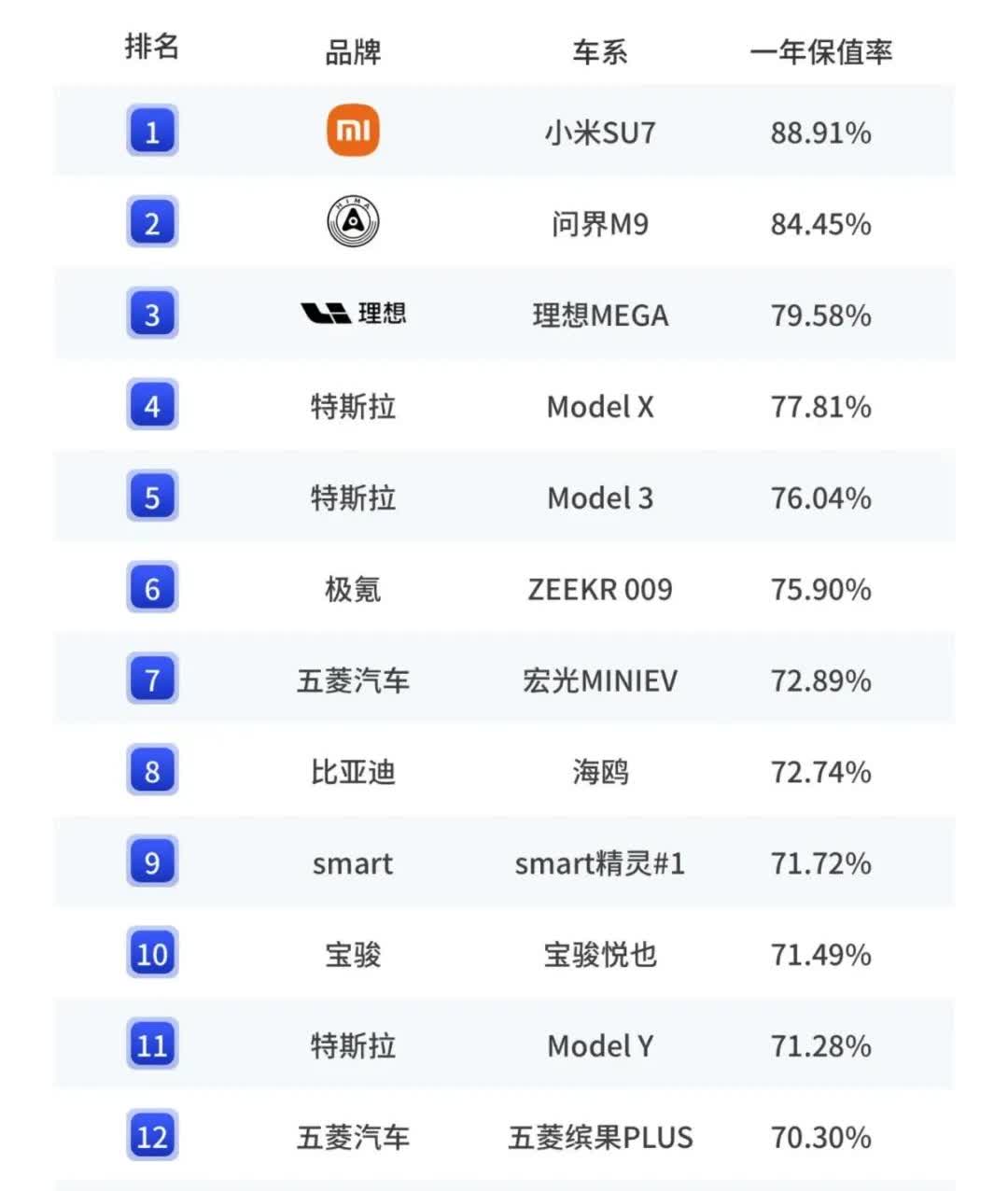 这回轮到小米遥遥领先了。 根据《2025上半年中国汽车保值率研究报告》显示,小米SU7的一年保值率88.91%,将近90%,在电车所有车型中排名第一。 雷布斯很高兴,表示:特斯拉保值率也不错,但这次小米领先了。 从排名看,第二第三是问界和理想。 咋滴,雷总,国产就这么不入您法眼啊,还是因为只有跟特斯拉比才有话题热点?