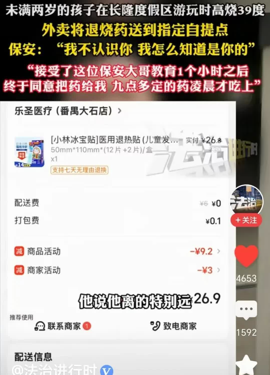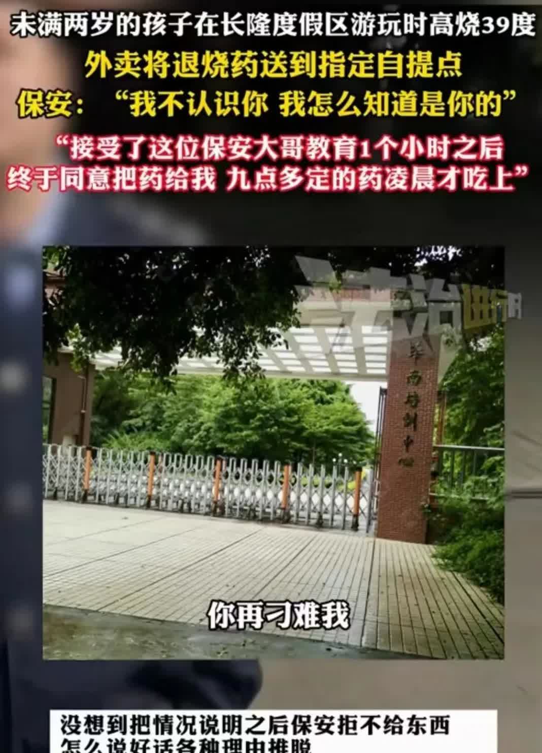 广东广州,男子带家人到度假区游玩,因未满2岁宝宝突然高烧至39度,男子急忙在外卖平台购买了退烧药。不料,当他赶到自提点时,却发现这里大门紧闭,苦等20分钟等来保安,却被以各种理由拒绝给药。经过男子苦口婆心的劝说和被教育1个小时后,才终于拿到药。他临时停在门口的汽车更被贴了3张罚单。男子气愤的把事情经过发至网上,瞬间引爆网络,网友调侃道:真是拿着鸡毛当令箭。 在广州长隆度假区里,有位爸爸带着家人玩时,小孩突然发起了高烧。这位爸爸急坏了,因为孩子才不到两岁,以前还有过高烧惊厥的情况,得赶紧吃药才行。由于对周围不熟悉,他就在外卖上买了药,平台显示附近有个自提点很方便。药很快就送到了,可当他跑到自提点时,却发现大门紧紧关着,只有一个保安亭亮着灯。 这位爸爸在门口心急如焚地等了20分钟,好不容易看到保安出来。他赶紧跟保安说,孩子烧得很厉害,急需退烧药,还把自己的订单、名字、电话都给保安看了。可没想到,保安一脸冷漠地说:“这里是保密的地方,不给人进的。”不管这位爸爸怎么求情,保安就是不开门。连送药的快递员也走了,没法回来帮忙。药就在眼前,但周先生就是拿不到。他急得快疯了,只好一遍遍跟人说好话,求了半天,被“教训”了一个小时后,人家才让他拿药。结果等他回到车上,一看,车窗上竟然被贴了3张罚单,就因为“停在了消防通道上”。 周先生强忍着火,赶紧回酒店给女儿喂药。之后,他把这事儿发到了网上,一下子就炸了锅,网友们都说那保安是“小题大做”。 这事儿后来引起了大家对基层执法人员和服务态度的大讨论,也让有关部门开始重视这种“死板执行”背后的管理漏洞。