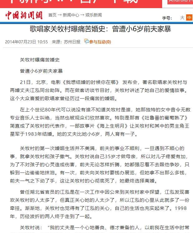 1990年的某日,歌唱家关牧村不堪丈夫家暴,毅然提出离婚。王星军称:“离便离,但房子与孩子,你只能择其一。””可关牧村的选择却让王星军傻了眼。 关牧村,1953年出生在河南新乡一个满族家庭,童年生活很苦。母亲是音乐教师,教她唱歌,家里总有音乐声。可她十岁那年,母亲因胃癌去世,父亲也丢了工作,家里日子过得紧巴巴。关牧村和弟弟只能捡菜市场扔掉的菜叶,回家煮成糊糊吃。晚上饿得睡不着,她就喝凉水充饥,然后哼唱母亲教的歌。她小时候就爱唱歌,嗓子清亮,邻居都喜欢听她唱。这样的生活虽然艰难,但她靠唱歌给自己打气,也给弟弟带来点安慰。 长大后,关牧村初中毕业,去了天津一家钢锉厂当工人。工厂里机器响个不停,她却总在休息时间给工友们唱歌。1973年,天津市职工文艺汇演上,她唱了《打起手鼓唱起歌》,嗓子厚实又有力量,台下掌声不断。作曲家施光南看中了她的天赋,推荐她加入天津歌舞团。她从此开始专业训练,1978年唱《吐鲁番的葡萄熟了》,一下子火遍全国,成了家喻户晓的歌唱家。她的歌声有种特别的温暖,很多人说听着她的歌就像回到家。 1983年,关牧村拍音乐故事片《海上升明月》,认识了比她小六岁的王星军。两人背景差不多,都有过苦日子,又都喜欢艺术,聊得特别投机。关牧村觉得王星军像个知己,拍戏时她常帮他,比如给他买吃的,或者请他到家里过年。1984年国庆节,两人结婚,婚后生了个儿子,日子一开始甜甜蜜蜜。可关牧村的事业越来越红火,频频登台演出,王星军却一直在小角色里打转,事业没啥起色。周围人开始说他是靠老婆吃饭,这话让他心里很不是滋味。 结婚几年后,关牧村的事业如日中天,全国跑演出,舞台上光芒四射。王星军却还是没什么名气,压力越来越大。他开始喝酒,脾气也变得暴躁。1988年,他们的儿子出生,关牧村35岁,特别疼儿子,甚至停下工作在家带孩子。家里开销全靠她,生活的担子却压在了王星军身上。他事业不顺,经常喝得醉醺醺回家,拿关牧村撒气。第一次动手,他打了她一巴掌,第二天清醒后道歉,保证再也不犯。关牧村为了儿子,选择原谅,可这只是个开始。 王星军的家暴越来越频繁,稍不顺心就动手。关牧村为了不让儿子受影响,一直忍着,没跟外人说。她觉得家丑不可外扬,默默承受着身体和心里的伤。1990年的一天晚上,事情到了临界点。儿子两岁,吓得躲在角落发抖,关牧村看着孩子的眼神,终于下定决心。她提出离婚,王星军冷笑着说,房子和孩子只能选一个。她毫不犹豫选了儿子,收拾几件衣服,带着孩子离开,净身出户,连房子都没要。王星军愣住了,没想到她这么果断。 离婚后,关牧村带着儿子搬到北京,租了个小房子,生活很拮据。她白天忙演出,晚上给儿子做饭,有时候钱不够,只能吃剩饭。她给儿子改了名字,叫关添元,希望他未来能添福添元。1991年,她登上央视春晚,唱《祝酒歌》,歌声依旧打动人心。她还参演了歌剧《屈原》,事业慢慢回暖。单亲妈妈的日子不好过,但她咬牙坚持,把对儿子的爱化成动力。她拒绝了很多人的劝说,没想过再婚,只想把儿子养好,事业做强。 1994年,关牧村在一场文化活动上认识了江泓。江泓是经济学博士,做过湖北省高官,也是她的歌迷。他去看她演出,主动帮忙联系场地,还常去她家探望。一次,关牧村钱包被偷,没钱买菜,江泓就陪她吃简单的面条,还夸她手艺好。江泓对她儿子特别好,带他去公园玩,教他读书写字。关牧村起初对感情有阴影,但江泓的真诚让她慢慢放下戒心。1998年,两人结婚,江泓把关添元当亲儿子养,给了他们母子一个温暖的家。 婚后,关牧村的事业更上一层楼。她多次登上央视春晚,2009年还开了全国巡回演唱会,唱《吐鲁番的葡萄熟了》时,台下观众跟着合唱。她被评为国家一级演员,还拿了金唱片奖,成了中国女中音的代表人物。江泓一直支持她,帮她打理生活琐事,让她能专心唱歌。关添元长大后考上北京对外经贸大学,后来去澳大利亚留学,回来做了茶叶公司董事长。关牧村的父亲也在她的撮合下再婚,晚年生活安稳。 如今,关牧村已经七十多岁,和江泓住在一处养老院,日子平静又幸福。她还常去敬老院唱歌,2024年春晚,她唱了《革命人永远是年轻》,嗓音还是那么有力量。王星军后来改行做导演,拍了《丝绸之路》《阿曼尼莎汗》等片,事业有了起色,但他一直单身,定居美国,偶尔和儿子联系。关牧村从没后悔离婚,她说那是最正确的选择,让她和儿子都过上了好日子。 关牧村的故事让人感慨,一个女人从苦日子走出来,靠歌声改变命运,又在婚姻的低谷里果断止损,找到幸福。她的经历是不是让你有啥想说的?欢迎在评论里聊聊你的看法,或者分享你听过的她的歌!