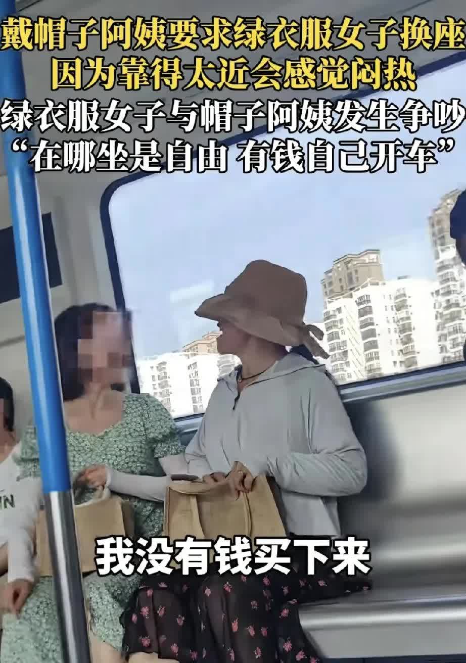 戴帽子的阿姨让绿衣服女子换座位,原因是靠得太近而觉得闷热。绿衣服女子回呛道:“我