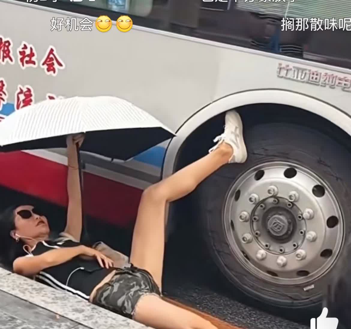 看姿势女子是和公交车杠上了。一只脚搭在公交的轮胎上,人躺在地上,关键是还撑着伞,