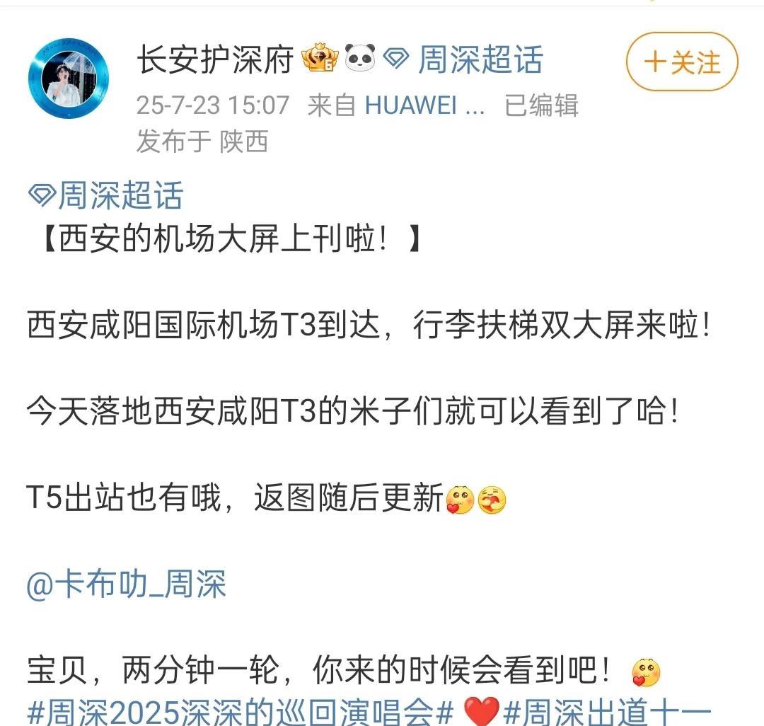 西安机场已经被周深应援包围了![呲牙] 据了解这是 西安机场第一次做明星粉丝应援!因为是周深才有可能!周深荣誉!生米荣誉! 脑补一下,周深落地一路低头一路尴尬小跑的样子[笑哭] 最后两张图 周深出道十一周年踩楼活动,可以去看看! #周深#