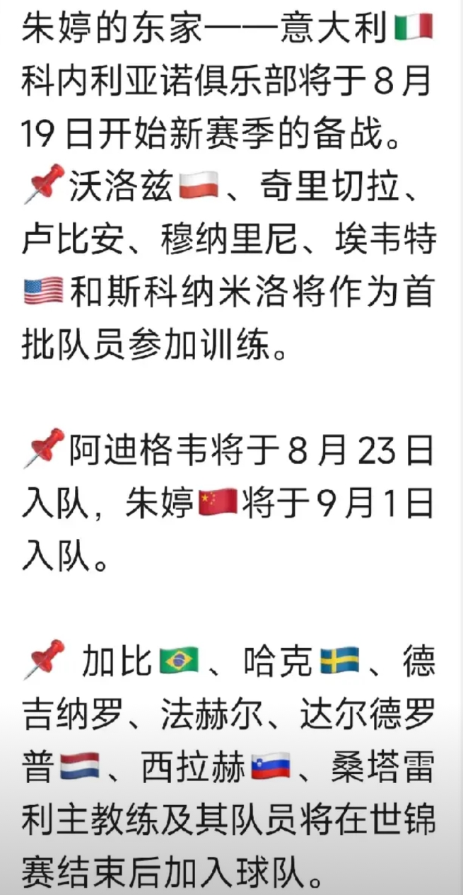 朱婷大概率将不参加全运会 2025年全运会于11月9日-21日在粤港澳举行排球项目决赛,女子成年组将于11月7日-11月19日,在澳门威尼斯人综艺馆、澳门东亚运动员体育馆举行。 中国女排著名球星朱婷,已经被是户籍所在地河南女排申报参加2025年全运会女排决赛。据称,目前在国内的朱婷,已经回到河南女排备战2025年全运会决赛阶段的比赛。然而,朱婷在意甲的母队科内利亚诺俱乐部的一则消息,让朱婷参加全运会女排比赛萌生了变数。 据科内利亚诺俱乐部的消息:意大利科内利亚诺俱乐部将于8月19日开始新赛季的备战。没有世锦赛比赛任务的沃洛兹、奇里切拉、卢比安、穆纳里尼、埃韦特和斯科纳米洛将作为首批队员参加训练。阿迪格韦将于8月23日入队,朱婷将于9月1日入队。加比、哈克、德吉纳罗、法赫尔、达尔德罗普、西拉赫、桑塔雷利主教练及其队员将在世锦赛结束后加入球队。 意大利女排意甲联赛,每个赛季基本上都是在10月初开始至来年4月底结束。这样女排意甲联赛就会和中国全运会女排比赛赛程重合,假设朱婷没有和科内利亚诺有特别的约定,朱婷将无法代表河南女排参加全运会女排比赛。即便是科内利亚诺女排准许朱婷请几天假参加全运会女排比赛,由于没有时间和球队一起磨合,比赛中能不能代替作用还不好说。