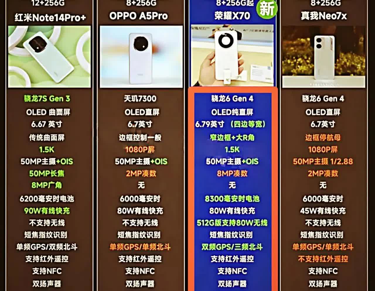 荣耀X70已连续三天位居全品牌全机型销量冠军。对荣耀而言,这还只是一个小目标果,其最终目标是破千万台销量,说永远成为用户最值得信任X系列机型。 (如图)对比竞品就知道,在荣耀 X70 所在的价位区间,竞品真是太弱了,看X70自身足够硬核:在续航、护眼、抗摔等方面实现碾压式领先;叠加国补后价格优势进一步放大,顶配版也只需 1699 元即可到手。 不得不说,谁能拒绝这样一台千元出头,却拥有 8300 mAh 大电池、80 W 有线快充、80 W 无线快充、IP69K 防水、十面抗摔、6000 nit 绿洲护眼屏、立体声双扬声器及全场景 NFC 的硬核手机呢?