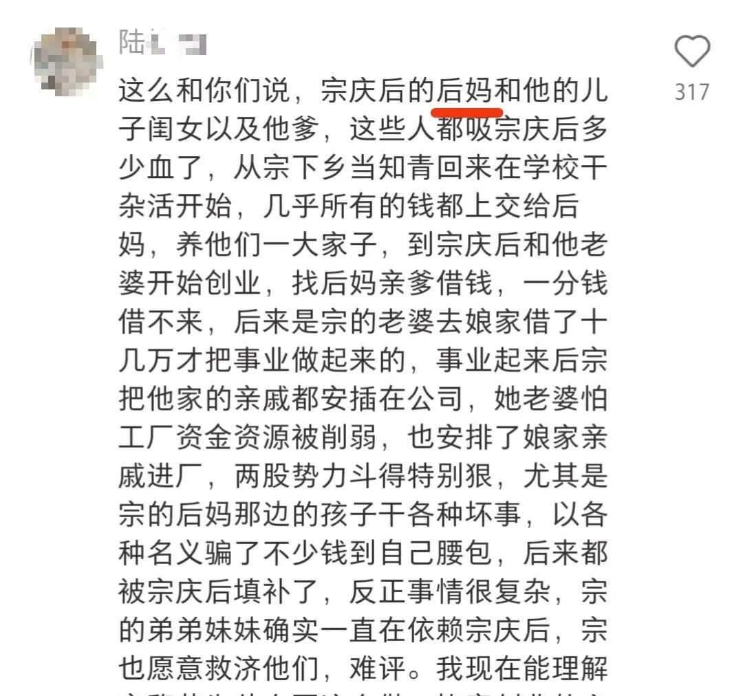 按这位网友写得,大小姐是不是得和她奶奶也得亲子鉴定一下啊! 他文章的大概思路就是: 1.老太太不是大小姐亲奶奶,所以对他爸不好。 这点局外人不可能知道真相,但的确长子15岁没钱供他学,宗庆后去农场干苦力。老三下乡当植护员,回来到杭州保灵有正式工作。 2.长子一家挣钱得上交全家花,创业老宗家不出钱,是施幼珍娘家出资。 挣钱得上交有可能,但我认为当时宗庆后有实力不外借就能把娃哈哈搞起来,因为87年他卖花粉口服液就赚了一大笔钱。他能承包校办工厂经销部时许诺交年底交10万,兜里没钱肯定不会这么有底气。 3.至于两方亲属进入公司互掐的戏码,这倒很有可能,现实生活中类似桥段不是啥稀奇事儿。
