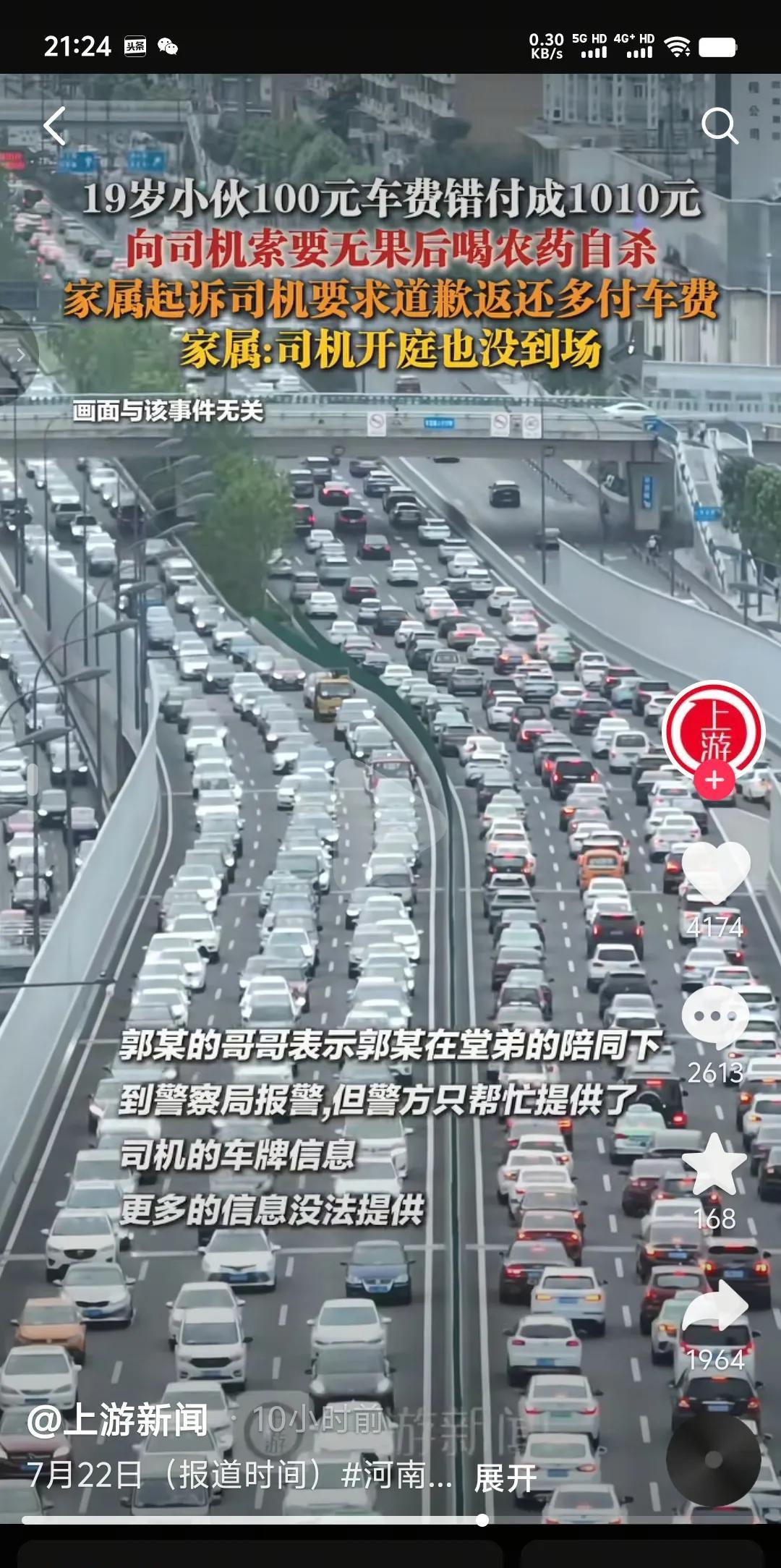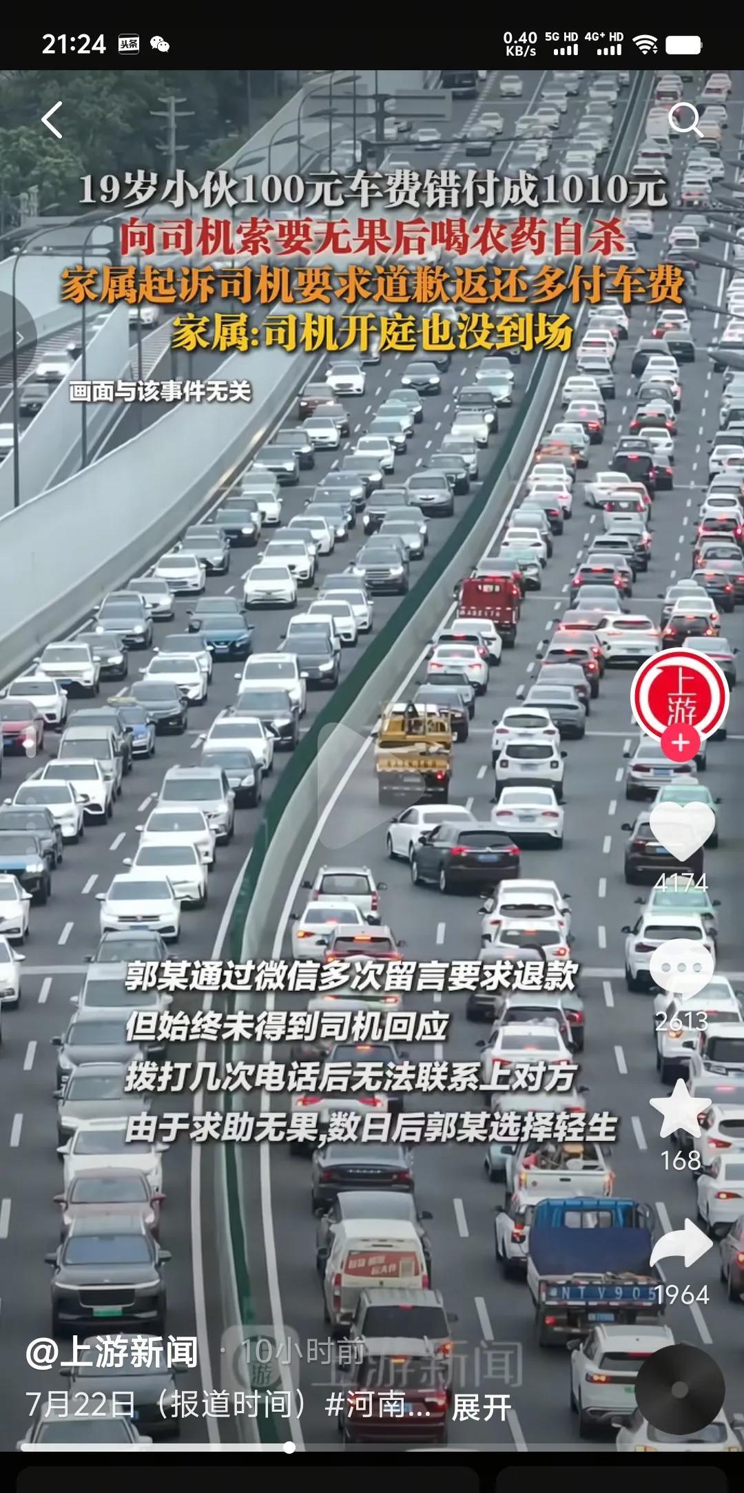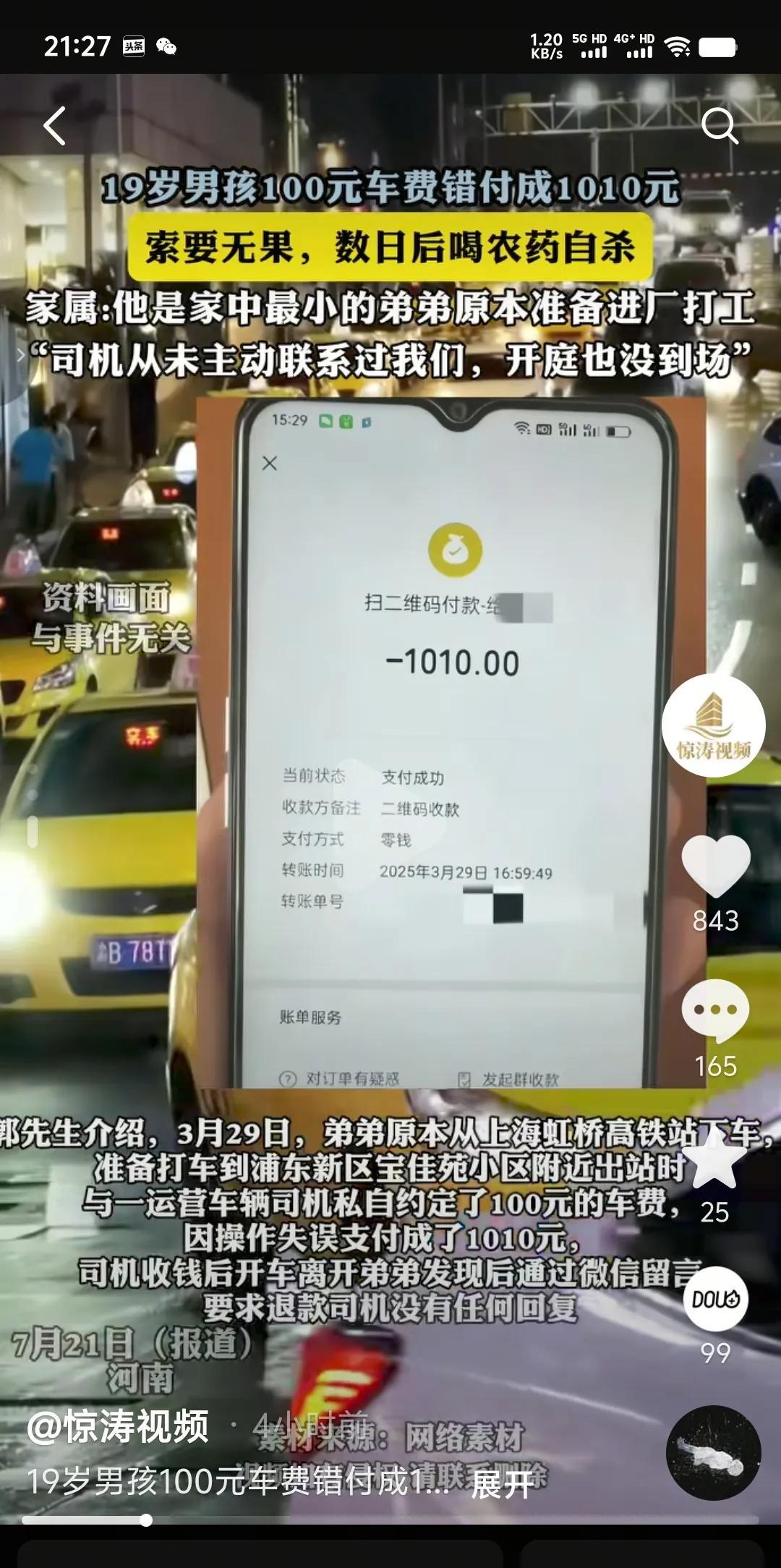 一块小小的儿童手表都能在八吨的垃圾堆里找到,为什么多付的910块钱却迟迟得不到解决。非常容易的一件事,非常明了的一件事,不存在任何争议。不属于自己的钱,理所当然就应该归还给别人。在当今网络时代,即便出租司机不接电话,拒绝归还那份不义之财,也能轻松的找到他,在确凿的证据面前,难道他还还耍赖不成?只可惜顺理成章的一件事却变得如此艰难,在人性的冷漠和无助面前,19岁的男孩那份仅存的最后一道希望终于破灭了。 多么低级的悲剧发生了,不是说19岁男孩死的低级,而是这样的悲剧发生在这样的社会让人感觉太低级了。