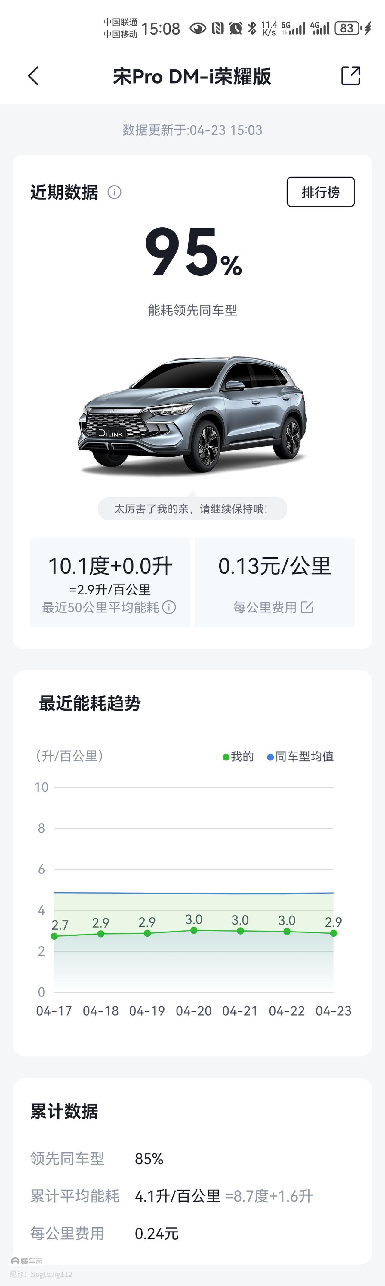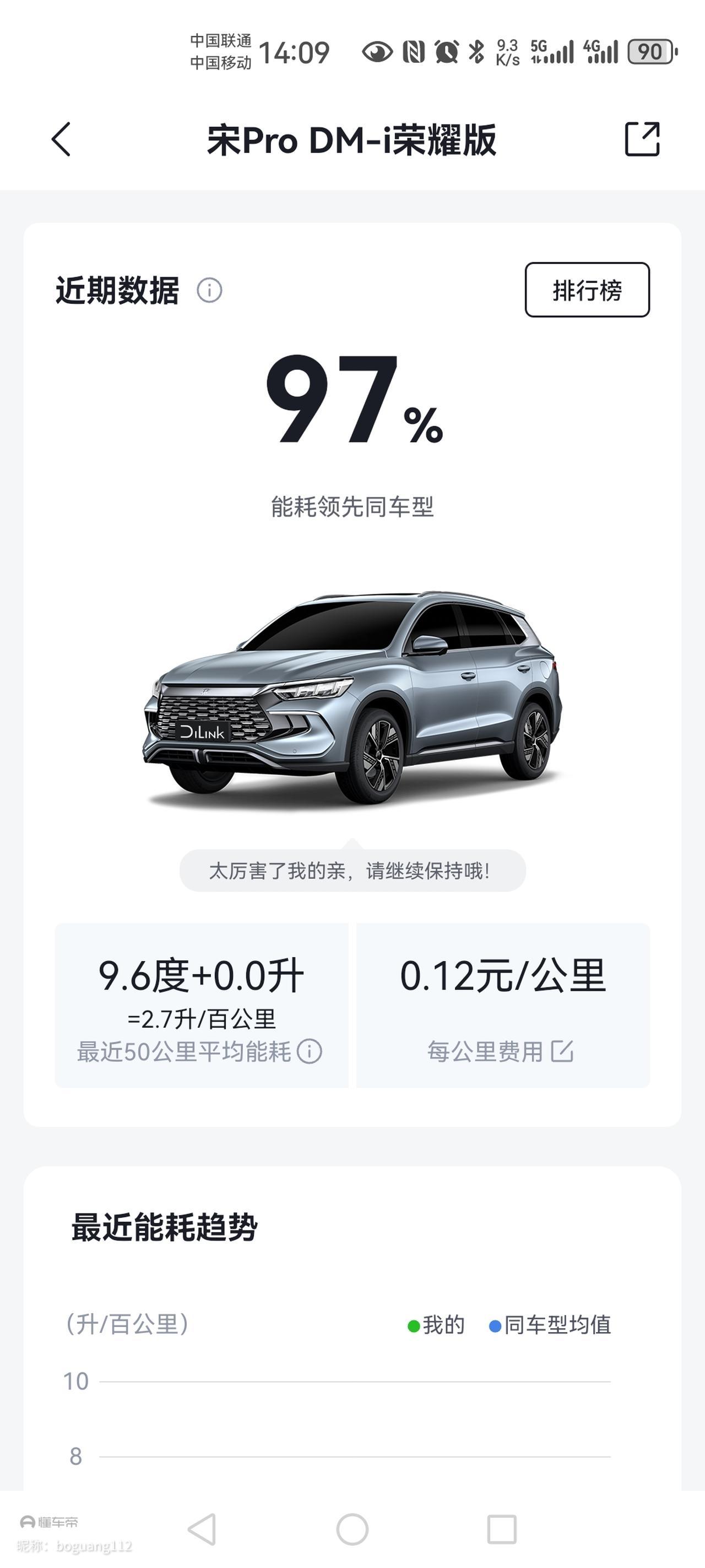我的2024款宋pro dmi,最好的能耗在9.6度/100km,等量油耗在2.7L/100km。这个是我跑了一万八千公里时的一个最佳状态。 当然也许有很多车友比我更优秀,但我想说的是,可能你的路况跟我不一样。 🚘 车型年款 2024款比亚迪宋pro dmi 📊 满电续航 满电时纯电续航可以跑130公里左右,春秋两季,不开空调。冬天大概90公里,温度10度左右。夏天开空调大概95公里左右,以上都到系统预留的25%电量。也就是实际消耗75%电量达成的。 📉 能耗记录 我一直有记录能耗的习惯,这样一方面可以监控车辆的表现,另外可以给自己提个醒,不是新能源车就可以随意跑,还得有方法技巧。比如你要想低能耗那么跟油车一样要轻踩油门缓加速,不急刹车。同时不要馈电长时间跑。 高速时就混动标准模式,智能保电70左右就够了。这样速度下来后,可以利用电池的电量来平衡整个路程的能耗和油耗。至于要不要强制保电,我反正试过,高速路段下强制也好智能保电也好,混动模式下油耗大差不差的。 但是纯电时在市区开eco模式,感觉跟标准模式相比没明显差异。不知道大家有没有跟我一样的感受。 📉 能耗分享 最低能耗前面也说过,2.7等量油耗,9.6电耗。这个是目前我开到最低的。 如果大家经常跑高速,还是纯电吧,插混真的不适合。一个是电池容量小必须混动模式跑,但高速油耗不低。另一个纯电高速虽然能耗也大,但整体电费便宜,平摊下来费用也还好。买新能源就是图智能化省钱,所以得达到预期才行。