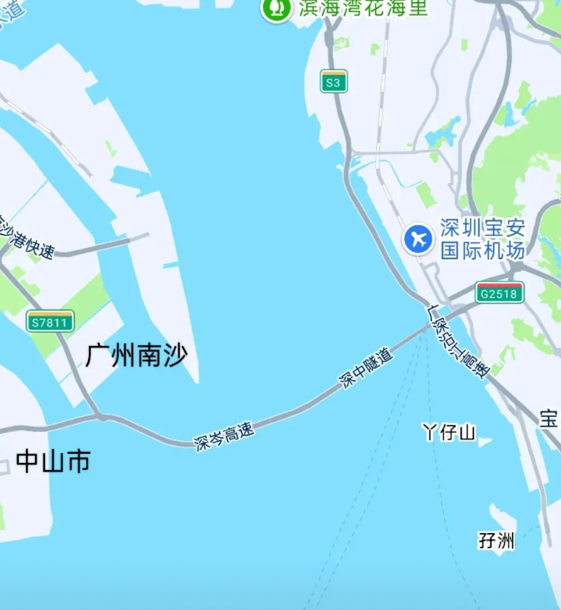 深圳机场距离广州南沙其实很近,不信你看图片,尤其是深中通道建成以后就更方便了,深中通道其实是直通广州南沙的,只是没有采纳像港珠澳大桥那样的三方命名方式,这个对广州好像不太友好,南沙虽然是郊区,也不至于那么没有存在感吧?