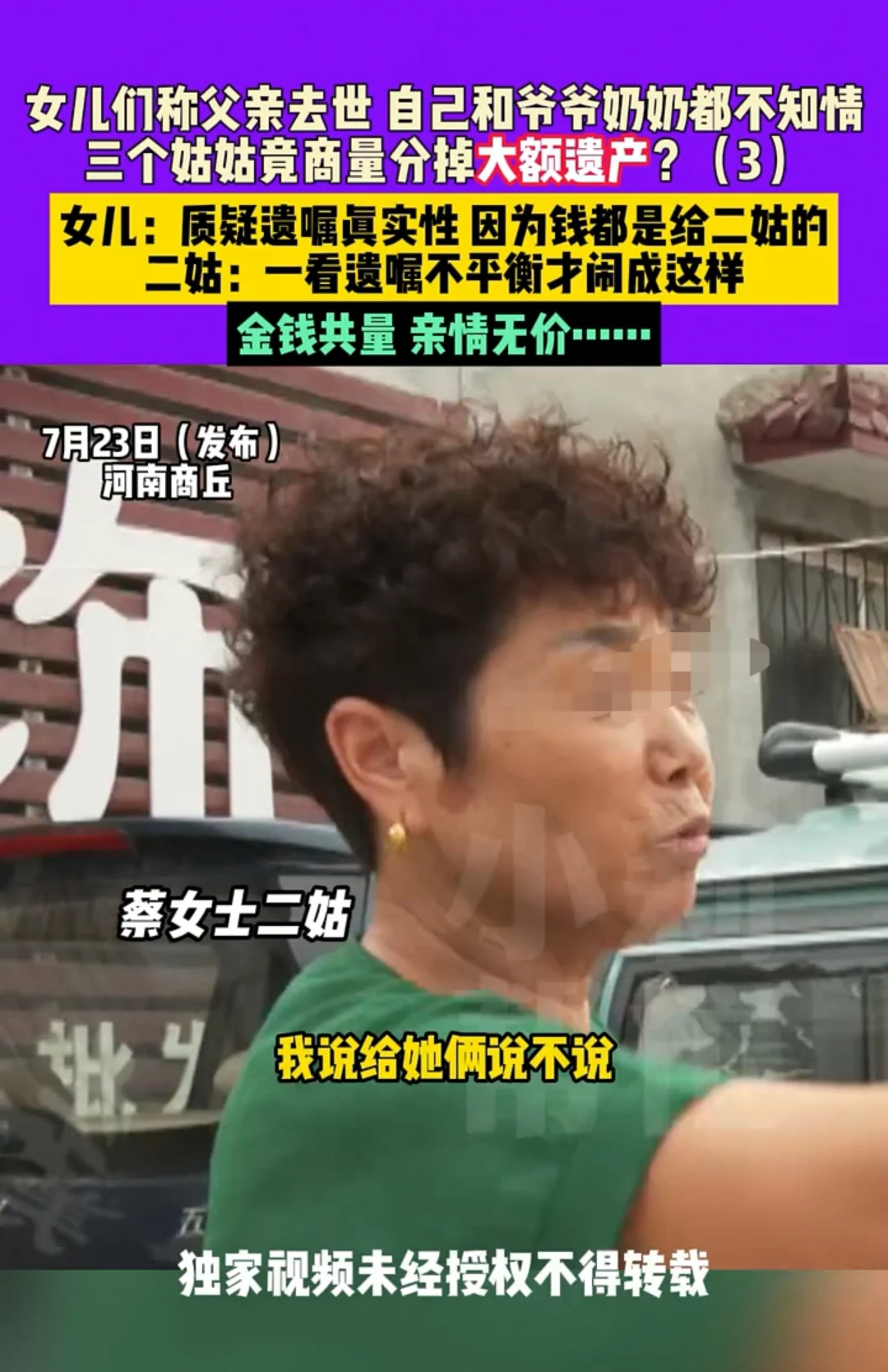 商丘,女子的父亲意外离世,她和爷爷一起长大。父亲离世后,二姑没有告诉她和爷爷,还伙同大姑和小姑一起将父亲的财产分割了。后来,小姑良心发现,赶紧告诉了女子。当女子上门讨要说法时,二姑却说是大姑不让说的;而大姑则说,二姑连自己哥哥离世都不知道,当时还睡着了,是二姑自己不让说的。