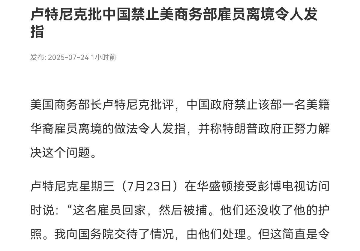 对中国的做法很愤怒,美国商务部长卢特尼克点名对我们进行批评!7月23日,美国商务部长卢特尼克声称,中国政府禁止该部一名美籍华裔雇员离境的做法令人发指,并称特朗普政府正努力解决这个问题。卢特尼克表示,这名雇员回家,然后被捕。他们还没收了他的护照。我向国务院交待了情况,由他们处理。 很显然,美国商务部长卢特尼克这是点名对我们进行批评。不过,我们要说的是,为什么此人被限制离境,美国方面不清楚原因吗?2025年4月12日,该雇员从新加坡转机抵达成都双流国际机场,欲使用144小时过境免签,却未在申请表上填写自己是政府雇员,只标注为普通商务旅行者。为什么该雇员不如实申报自己的政府身份呢? 根据中国《出境入境管理法》规定,危害国家安全或涉及未结案件者,可被依法限制出境。因此,在我们将相关情形未调查清楚之前,我们当然要对其进行限制出境。美国方面对我们进行批评,不过,我们对于此事将进行依法处理,美国政府也没有权利干涉我们的司法。任何人在中国,都必须遵守中国的法律。很显然,美国人不是例外。