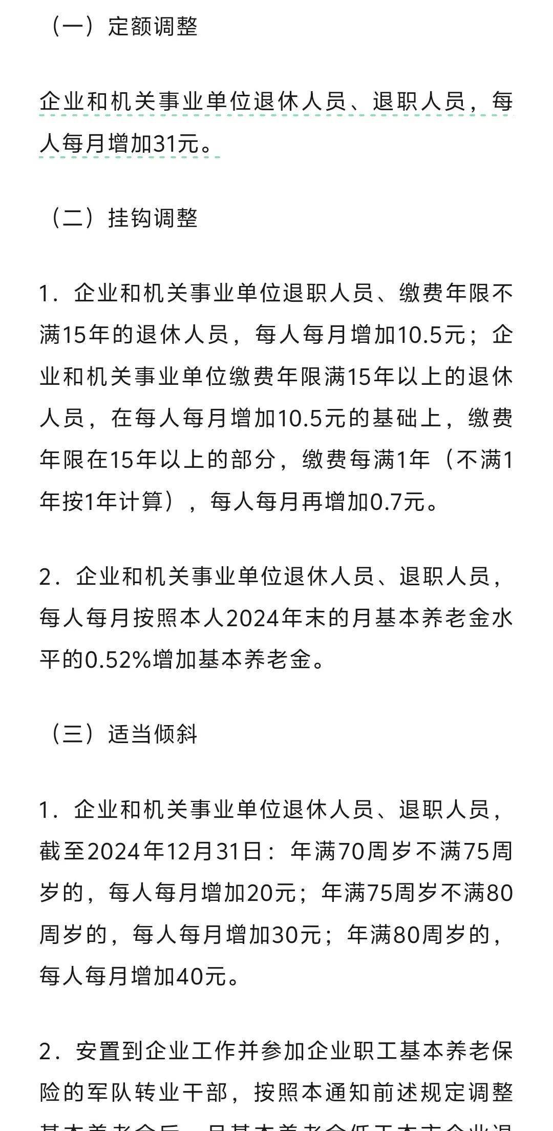天津退休人员!月底将收到一笔钱! 咱天津的养老金方案已经确定,快看看能涨多少?今年的养老金调整方案跟去年相似咱们就简单的说一下大家看正式文件。 调整范围:对2024年12月31日前已办理退休手续的退休人员。 一、定额调整:每人每月增加31元。 二、挂钩调整: (1)缴费年限增加 (2)额定增加:2024年末养老金0.52%增加基本养老金。 三、适当倾斜:年满70周岁以上老人额外再加! #分享城市新鲜事#