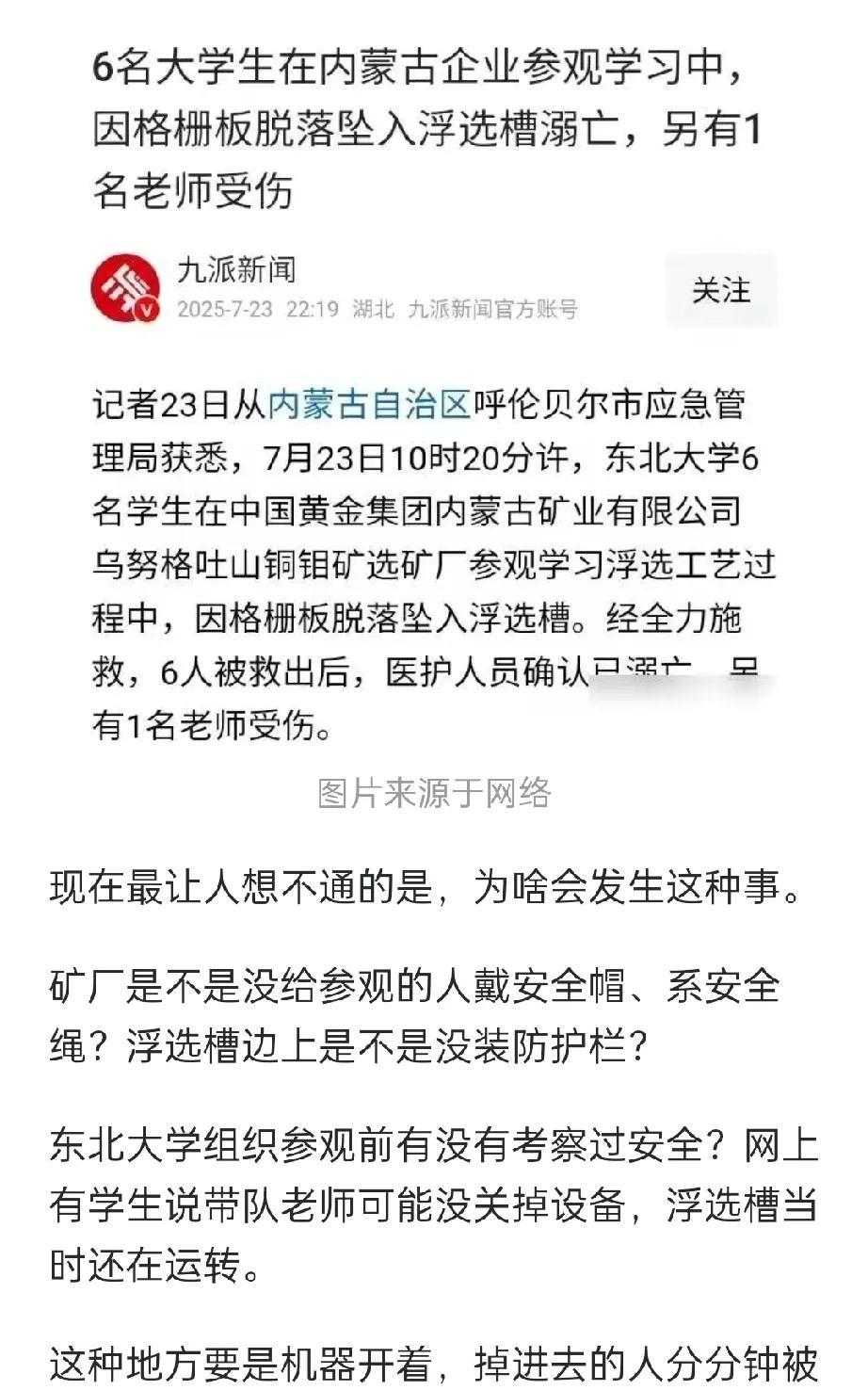 痛心,真的太痛心了,东北大学六名学生在内蒙古乌努格吐山铜钼矿参观时,因格栅板脱坠