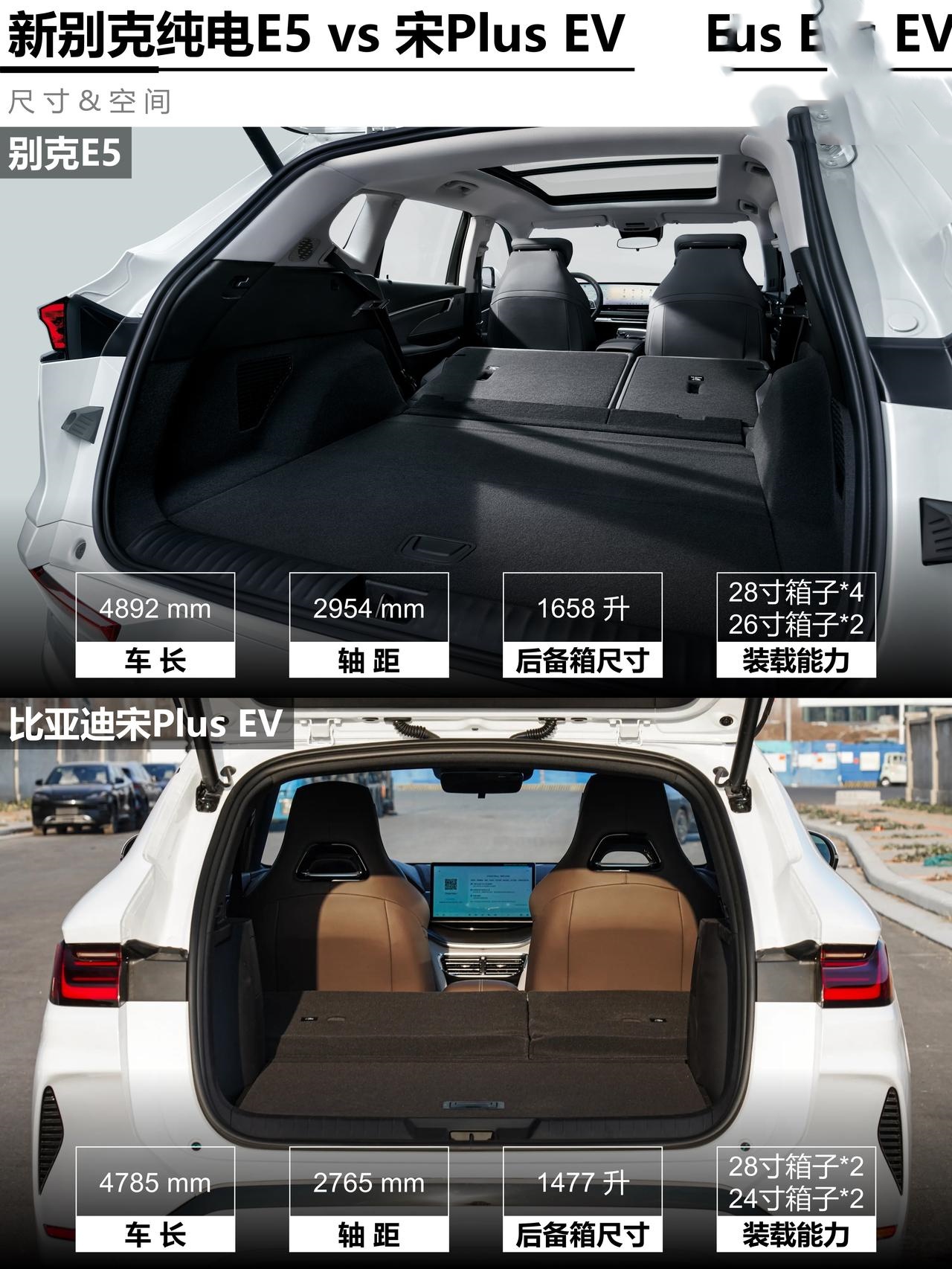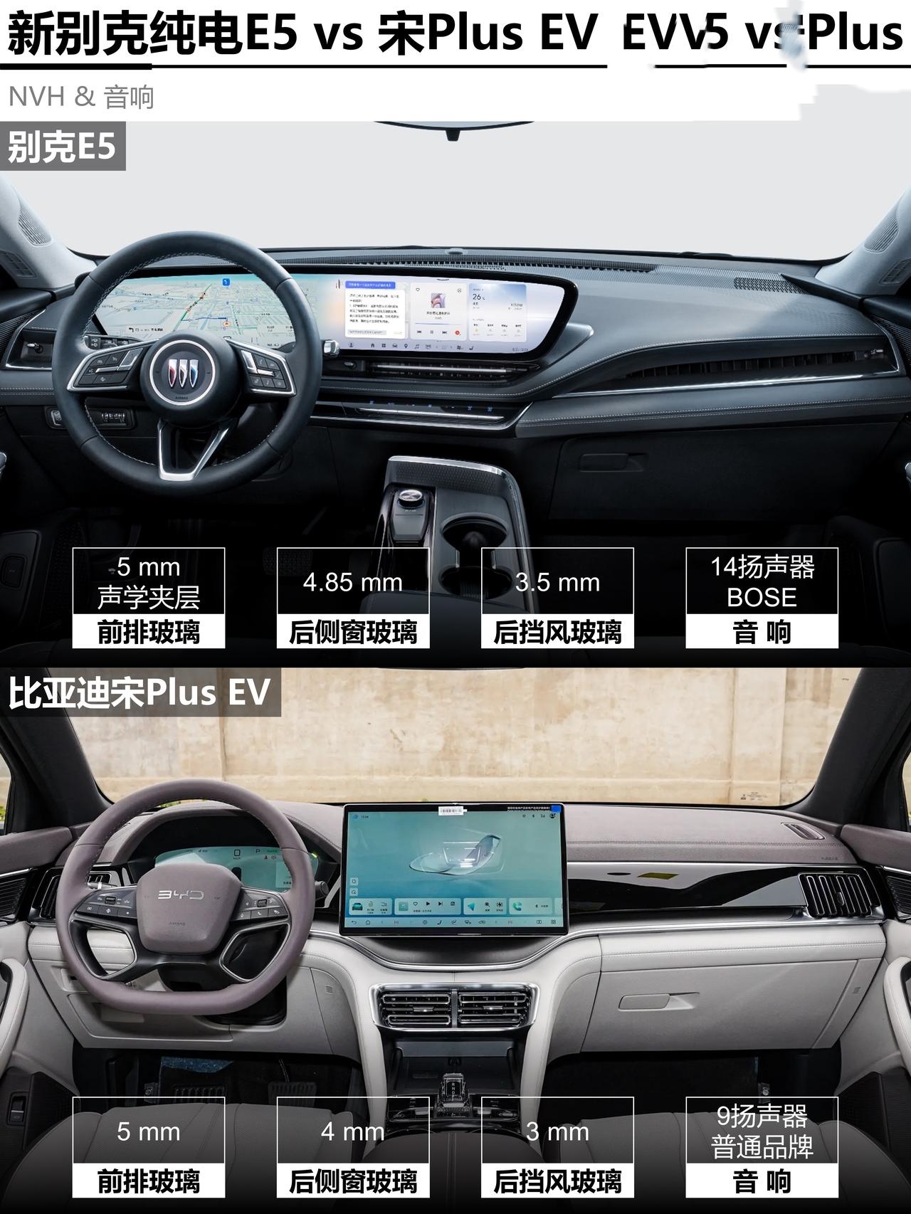 在新能源车大卷特卷的大版本里,💰15万已经能买到各方面都很优秀的车了,最近收到私信,有粉丝在新别克纯电E5&宋PlusEV之间纠结,今天我们就来对比一下 🆚比安全 🚘新别克纯电E5车身高强度钢占比78%,奥特能2.0电池提前两年满足“新国标”,CTP一体化电池包结构通过了远超国标的安全测试:单体电芯热失控后,静置两周不🔥/不💥。上市两年,累计行驶10亿公里,0️⃣自燃 🚘宋Plus车身高强度钢占比68%,采用比亚迪招牌刀片电池,安全性比较让人放心 🆚比空间 🚘新别克纯电E5拥有越级的4892mm车长和2954mm轴距,带来的是乘坐、储物空间全方位宽敞,腿部、头部空间都很充裕,后备箱实测能放4个28寸➕2个26寸行李箱 🚘宋Plus车长4785mm,轴距2765mm,同级别中空间表现可圈可点,后备箱能放2个28寸➕2个24寸行李箱,比较实用 🆚比舒适 🚘新别克纯电E5座椅特别宽(1482mm),采用双硬度发泡设计,并且配备了宽体悬浮头枕,从肩颈到腰背到臀部,都很舒服 🚘宋Plus则采用发泡塑料+普通软包材质座椅,头枕是一体化设计,一般运动车型上更常见 🆚比续航 🚘别克E5 CLTC纯电续航最高620km,并且实际验证了行驶80万公里后电池健康度不低于85%。 🚘宋Plus CLTC纯电续航最高605km 🆚比安静 🚘新别克纯电E5在前挡和前侧窗采用厚度5mm的夹胶静音玻璃,4.85mm的后侧窗以及3.5mm的后挡,底盘经过静音处理,有效隔绝风噪、胎噪和路噪,还有14扬声器Bose音响系统 🚘宋Plus前档和前侧窗同样采用5mm夹胶玻璃,静音效果也不错,后侧窗厚度为4mm,后挡3mm,9扬声器普通音响日常通勤也够用 ⭐总结 ✅宋Plus最大优势是前期爆卖积累的市场口碑, 以及智驾版上新后获得的高阶辅助驾驶能力,从家用角度来看,也是比较省心的选择 ✅新别克纯电E5越级的尺寸空间表现、静谧和舒适的座舱环境,保障了舒心出行。奥特能平台赋能的电池电控、以及过硬的车身用料,带来了安心的驾驶体验