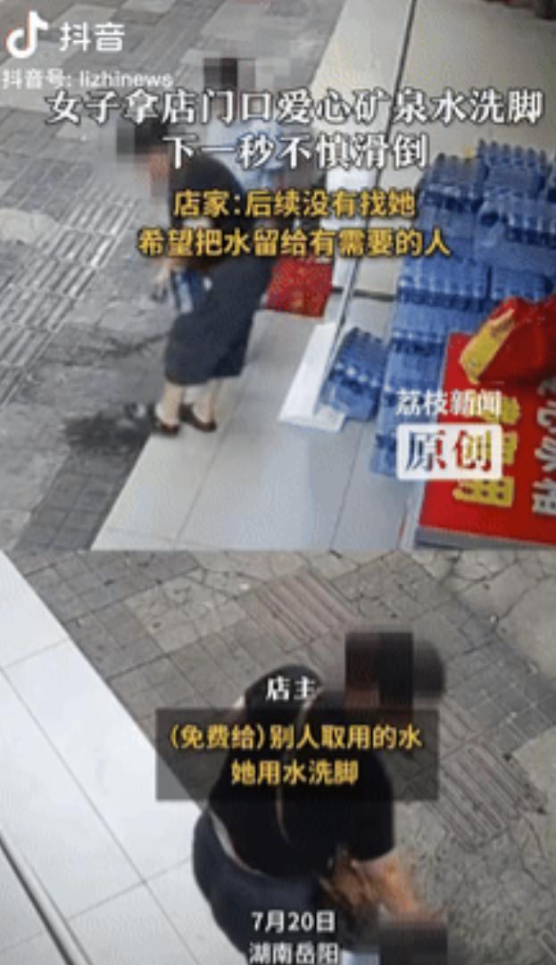 “缺大德了!”湖南岳阳,一店主为帮助他人,专门在店前设立了爱心冰箱,谁有需要都能免费领取,不料,一女子拿完水后,没着急喝,反而用来洗脚,结果下一秒就悲剧了,网友:果然举头三尺有神明! 时值盛夏,湖南岳阳热得人喘不过气,毒辣的太阳把柏油路面晒得滋滋冒热气,沿街不少店主看着街上挥汗如雨的行人,心里都不是滋味。 于是有人牵头大家自发在门口摆起了 “爱心冰箱”,里面塞满了冰镇饮用水,专门给那些在烈日下奔波的户外工作者,或是任何有需要的人递上一份清凉。 店主们的想法挺简单,就是想给这座被热浪包裹的城市添点暖意,让这份善意像水一样慢慢流动起来,他们也琢磨过只要不是有人故意浪费,路过的人口渴了拿一两瓶完全没问题。 这小小的便利本就是为了帮大家解暑降温,算得上是酷暑里的一点慰藉,这本该是件让付出的人欣慰,让受助的人感激的好事。 谁知道一份纯粹的善意,却撞上了让人哭笑不得的现实,监控里拍到一名女子路过爱心冰箱,很自然地打开柜门,拿了两瓶冰水。 不过她不是因为口渴,只见她蹲在台阶上,看着自己沾了灰的凉鞋,竟直接拧开瓶盖就往脚上倒,顺着台阶往下淌的水在阳光下闪着晃眼的光。 她一边用手抹着脚踝,一边还往台阶上蹭,丝毫没顾着脚下湿滑,也没想想这水本是给人解渴的, 这种行为真不只是浪费两瓶水那么简单,它透着一股理所当然的自私,也像是在踩踏陌生人最朴素的善意。 你想想一瓶在高温下能让环卫工人或外卖小哥猛灌两口缓口气的 “救命水”,转眼成了冲脚的废水,这种落差足以让那些好心店主的心凉半截。 更巧的是因为冲脚的水积在台阶上,女子起身时脚下一滑,重心顿时没了准头,结结实实摔在地上。 更有意思的是,她摔倒后双膝正好磕在爱心冰箱前面,那姿势看上去倒像是在为自己的行为做一场无声的忏悔。 后来这段视频传到网上,有网友忍不住调侃:“还挺懂礼貌,洗完脚知道跪下道个谢。” 这突如其来的 “现世报”,让好多人感叹,或许这就是老话说的因果吧。 当时她身边还站着两个孩子,大概是她的儿女,虽然大人的行为实在不妥,但孩子们看到她摔倒,还是下意识地伸手想去扶,那小小的动作里,透着孩子们本能的善良,跟刚才发生的一幕形成了鲜明对比。 后来店主发现门口总有水渍,好奇之下调了监控,才看到这又好气又好笑的全过程,他没去追查这名女子是谁,也没在网上指责什么,只是把视频发了出来,想提醒大家珍惜这份来之不易的善意,别再让类似的事情发生,别让这份爱心白白浪费了。 店主自己也坦言心里确实不是滋味,甚至有点担心,他怕自己的善举到头来 “打了水漂”,更怕这种不珍惜的行为多了,以后没人再愿意做这样的好事,这不仅是对他个人的打击,搞不好会动摇整个社会善意传递的链条,真能让好多热心人彻底寒心。 (信息来源:荔枝新闻 2025年7月21日)