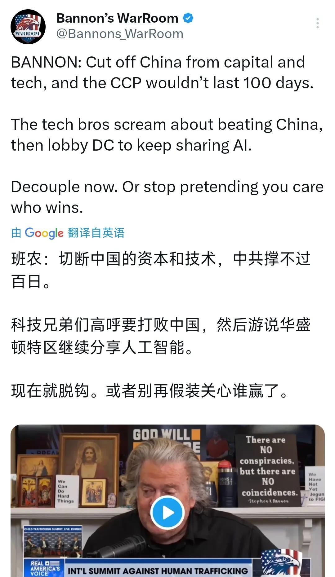 班农昨晚(北京时间7月23日)叫嚣道:“切断中国与资本和技术的联系,中共撑不过100天。那些科技大佬高呼要打败中国,然后又游说华盛顿继续共享人工智能。现在就脱钩,否则别再假装你在乎谁会赢。” [机智]评几句:班农之流不过是在痴人说梦!中国岂是能被几句叫嚣就吓倒的?切断中国与资本和技术的联系,就想让中共撑不过 100 天,简直是荒谬至极。中国凭借自身庞大市场、勤劳智慧的人民和强大科研能力,早已走出独立自主的发展道路。那些美国科技大佬的矛盾行径,恰恰说明与中国合作才是共赢之选。班农鼓吹的“脱钩”,是逆全球化潮流而动。中国不是吓大的,在挑战面前只会越战越勇,实现更高质量的发展!