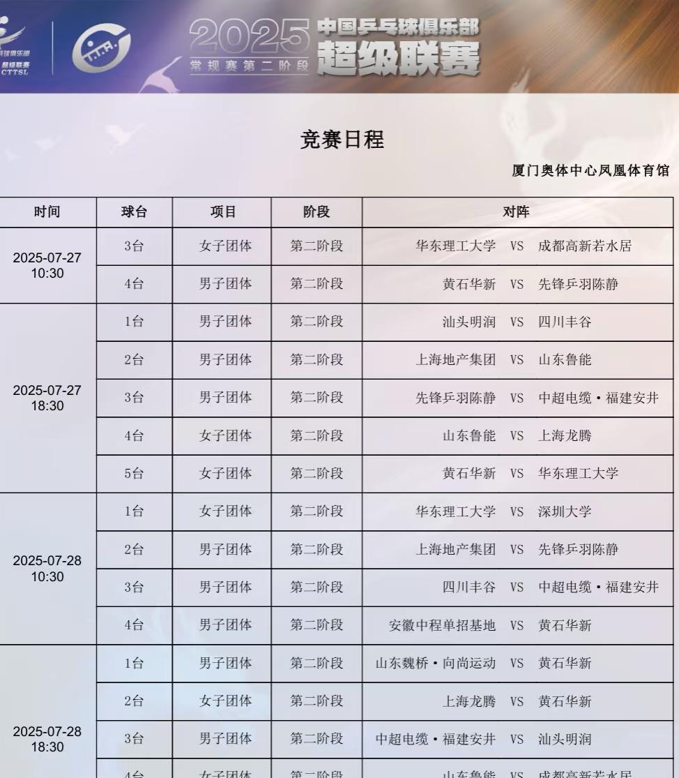 乒超联赛第二阶段赛程(带球台版) 7月24日,乒超联赛第二阶段赛程安排, 来源于