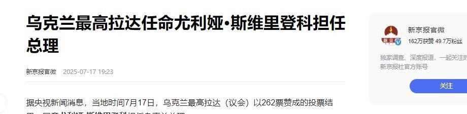 2025年7月17日,乌克兰最高拉达以262票的压倒性支持,通过了对39岁女政治家的任命:尤利娅·斯维里登科担任新一任总理,接替辞职的什米哈尔。这一任命在短短72小时内完成,创下了乌克兰战时政府更替的历史纪录,标志着乌克兰在不断变化的政治和军事局势中进入了新的篇章。