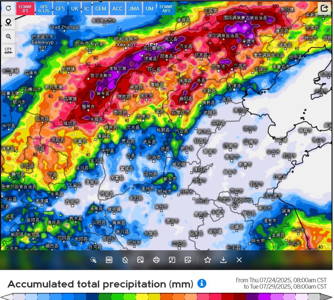 预计未来三天副热带高压将持续偏北偏强,588位势区将稳定控制我国华北中南部和黄淮大部地区,导致我国主雨带位置大幅偏北,来到西北东部、华北北部和东北中部一带,内蒙古中部、山西北部、京津冀中北部、辽宁北部、吉林中北部地区将迎来一轮持续性强降雨过程。数值预报给出的累计降雨量极大,尤其是内蒙古中部乌兰察布市附近,未来三天的累积雨量就有可能超过200毫米,对当地来说算是罕见的极端暴雨过程,华北北部的朋友务必注意防范。